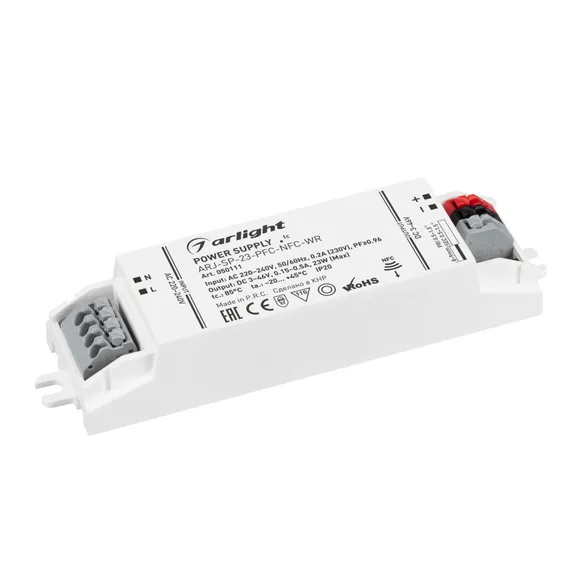 Мультитоковый блок питания с гальванической развязкой. Входное напряжение 220-240 VAC. Выходные параметры: 3-46В (150-500мA), 23Вт, PF >0,96. Негерметичный пластиковый корпус IP 20. Выбор значения выходного тока осуществляется с помощью NFC технологии. Габаритные размеры длина 104 мм , ширина 30 мм, высота 22 мм. Гарантийный срок 5 лет.