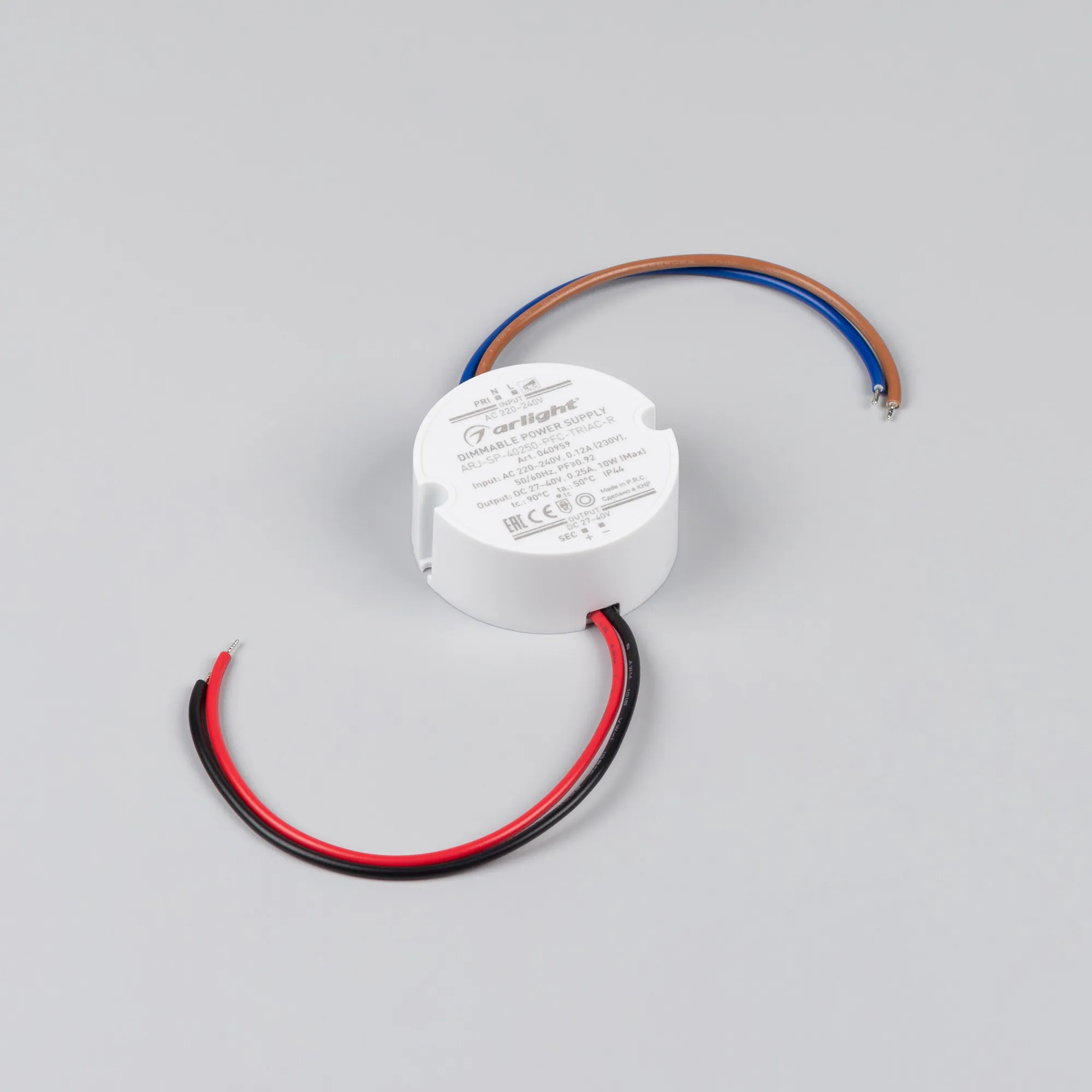 Диммируемый источник тока по стандарту TRIAC с гальванической развязкой для светильников и мощных светодиодов. Входное напряжение 220-240 VAC. Выходные параметры: 27-40 В, 250 mА, 10 Вт. Встроенный PFC >0,92. Негерметичный пластиковый корпус IP 44. Габаритные размеры: диаметр в окружности Ø51 мм, высота 22 мм. Гарантийный срок 5 лет.