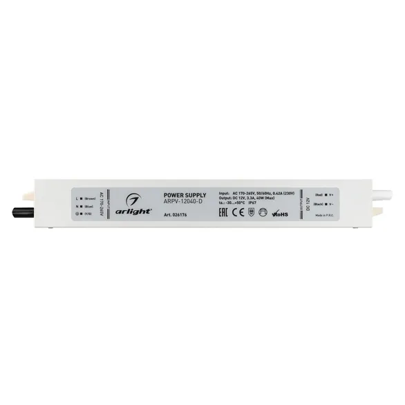 Источник напряжения с гальванической развязкой для светодиодных изделий. Входное напряжение 170-265 VAC. Выходные параметры: 12 В, 3,3 А, 40 Вт. Герметичный алюминиевый корпус IP 67. Рабочая температура -30…+50C⁰. Габаритные размеры длина 217 мм, ширина 30 мм, высота 20 мм. Гарантийный срок 3 года.