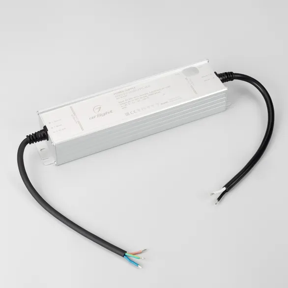 Регулируемый источник напряжения и тока с гальванической развязкой для светодиодных изделий. Входное напряжение 200-277 VAC. Выходные параметры: в режиме постоянного напряжения 22-26 В (установка по умолчанию 24В), 14.58 А с возможностью регулировки, 350 Вт. Встроенный PFC >0,98. Герметичный алюминиевый корпус IP65. Рабочая температура -40…+70C⁰. Габаритные размеры длина 261 мм, ширина 62.5 мм, высота 41.4 мм. Гарантийный срок 5 лет.