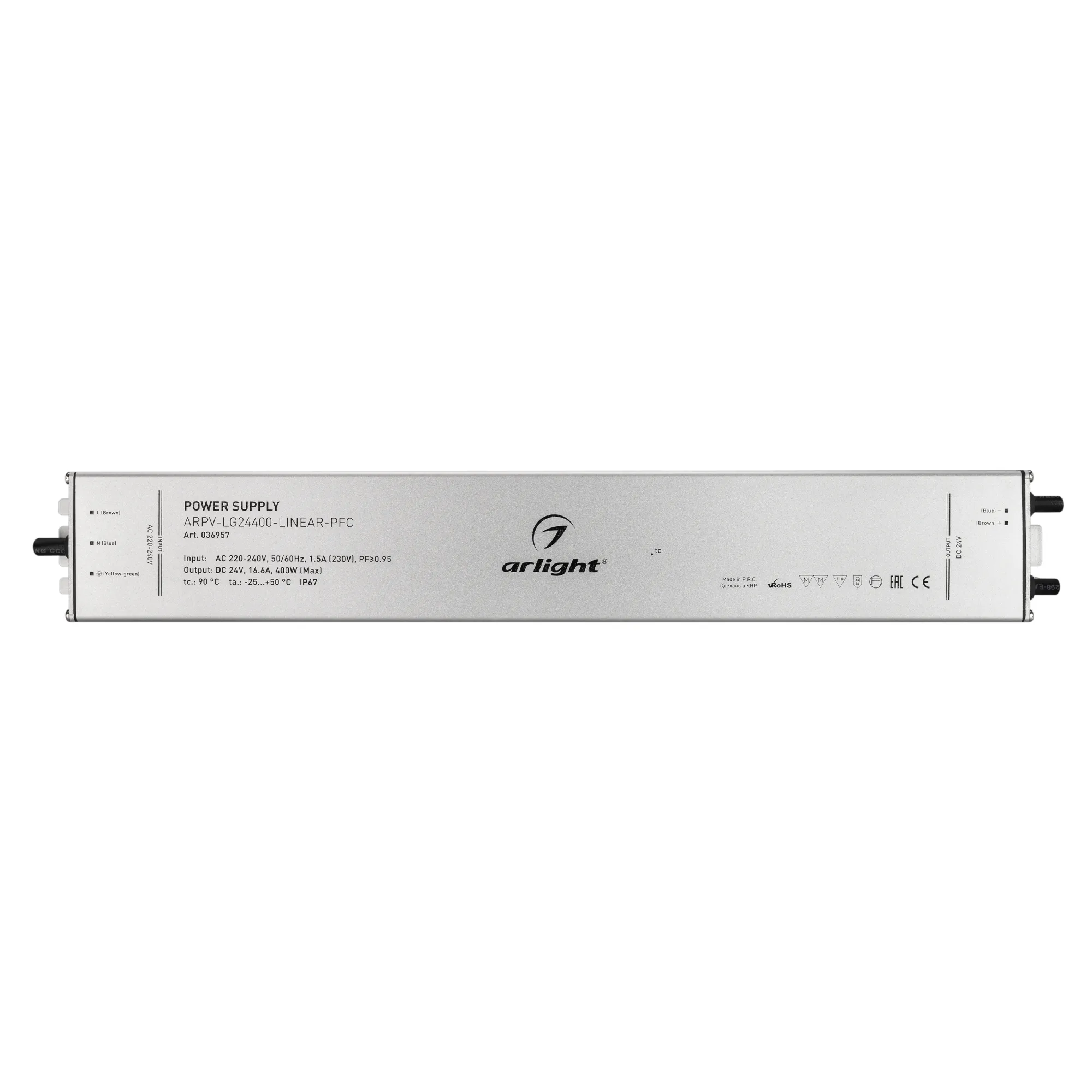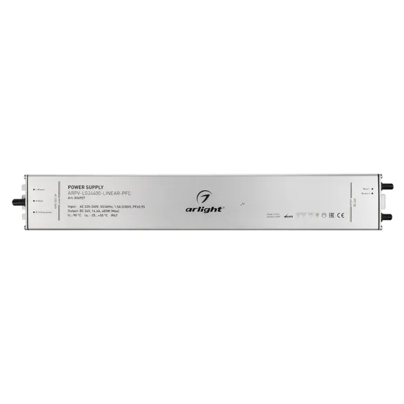 Источник напряжения с гальванической развязкой для светодиодных изделий. Входное напряжение 220-240 VAC. Выходные параметры: 24 В, 16.6 А, 400 Вт. Встроенный PFC >0.95. Тонкий металлический корпус IP67. Вход: 220-240VAC. Выход: 24VDC. Размер 400х60х22 mm.. Совместимость со стандартом EMC. Гарантия 5 лет. Допускается использование только внутри помещений.