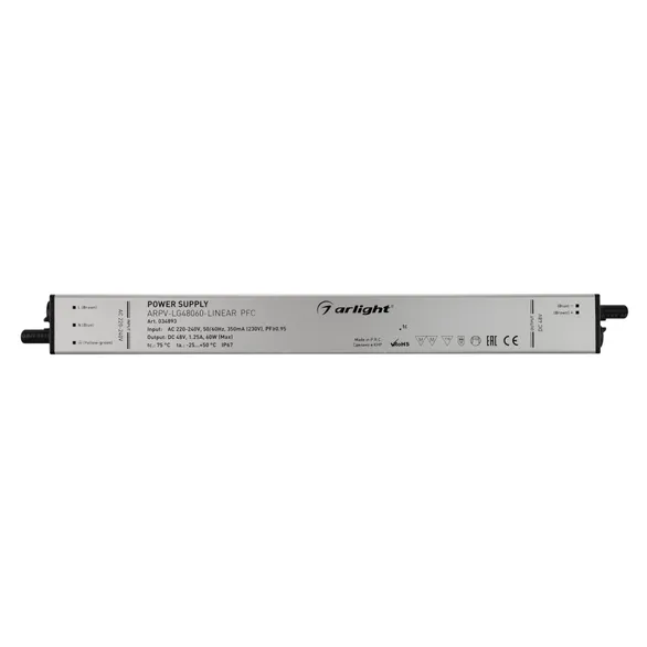 Источник напряжения с гальванической развязкой для светодиодных изделий. Входное напряжение 220-240 VAC. Выходные параметры: 48 В, 1.25 А, 60 Вт. Встроенный PFC >0.95. Тонкий металлический корпус IP67. Вход: 220-240VAC. Выход: 48VDC. Размер 290х30х21 mm.. Совместимость со стандартом EMC. Гарантия 5 лет. Допускается использование только внутри помещений.