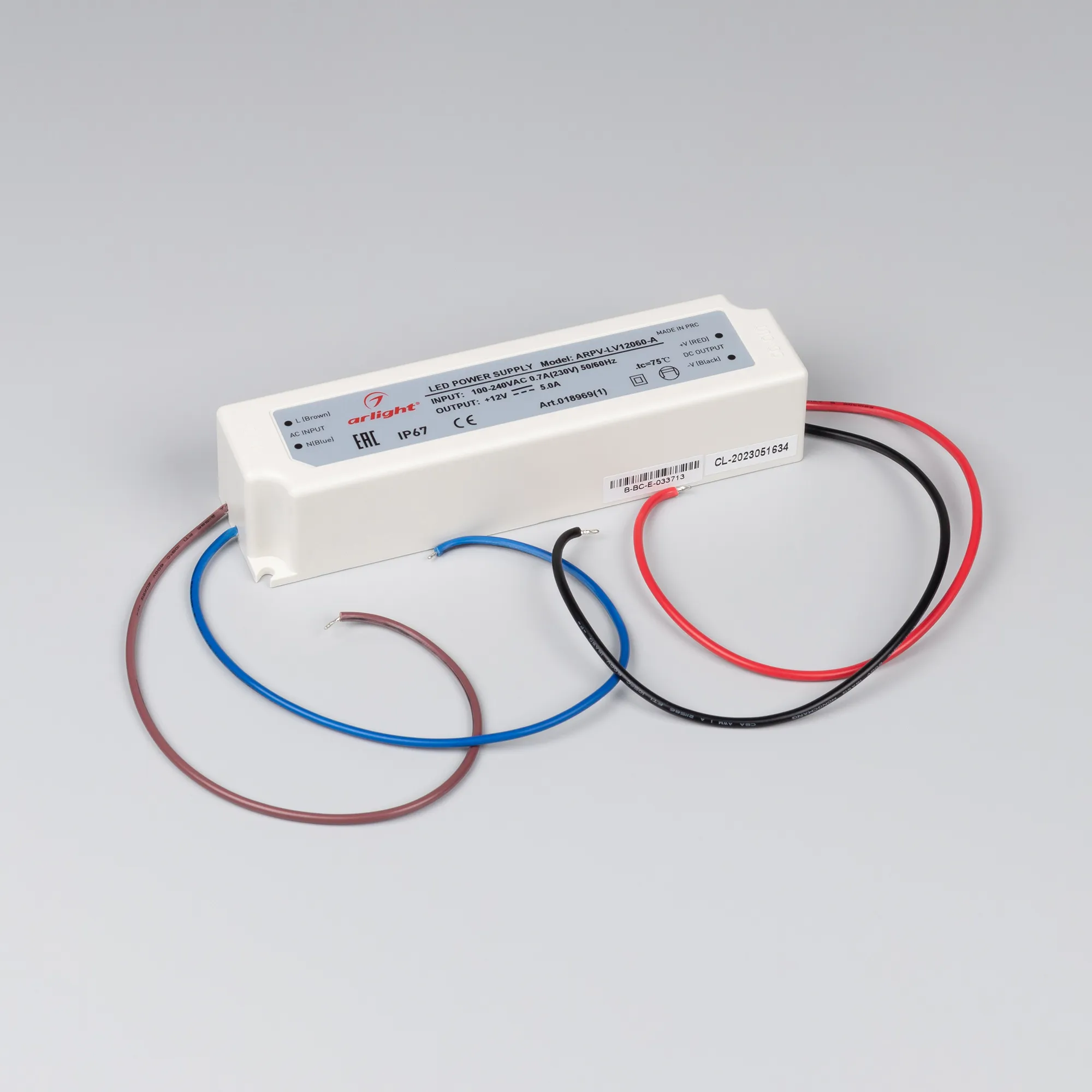 Источник напряжения с гальванической развязкой для светодиодных изделий. Входное напряжение 100 - 240 VAC. Выходные параметры: 12 В, 5 А, 60 Вт. Герметичный пластиковый корпус IP 67. Рабочая температура -30…+70C⁰. Габаритные размеры длина 162 мм, ширина 43 мм, высота 32 мм. Гарантийный срок 3 года.