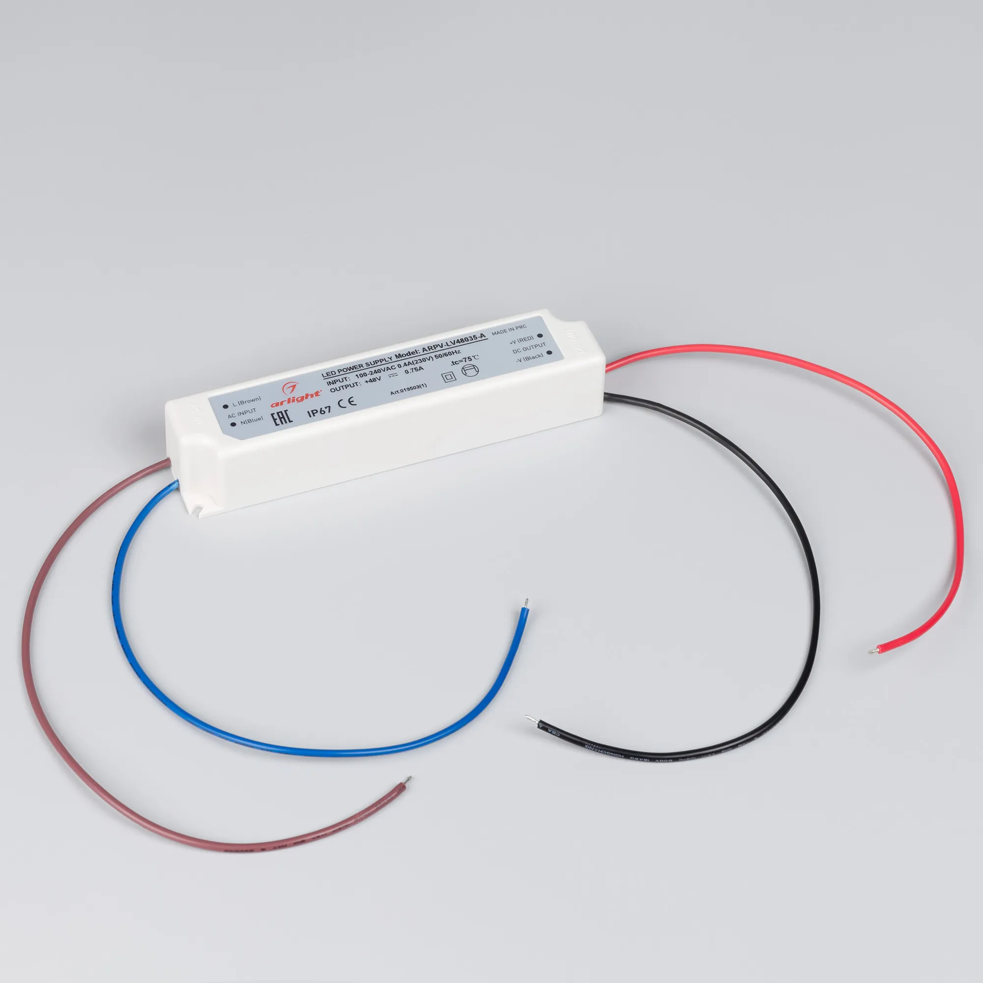 Источник напряжения с гальванической развязкой для светодиодных изделий. Входное напряжение 100-240 VAC. Выходные параметры: 48 В, 0,75 А, 36 Вт. Герметичный пластиковый корпус IP 67. Рабочая температура -20…+50C⁰. Габаритные размеры длина 148 мм, ширина 32 мм, высота 29 мм. Гарантийный срок 3 года.