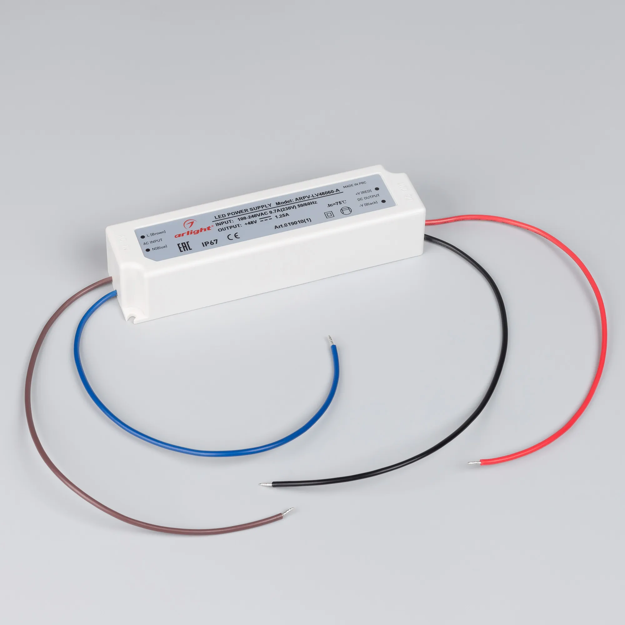 Источник напряжения с гальванической развязкой для светодиодных изделий. Входное напряжение 100-240 VAC. Выходные параметры: 48 В, 1,25 А, 60 Вт. Герметичный пластиковый корпус IP 67. Рабочая температура -30…+70C⁰. Габаритные размеры длина 162 мм, ширина 42 мм, высота 34 мм. Гарантийный срок 3 года.
