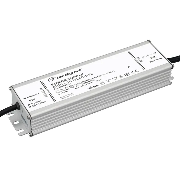 Источник напряжения с гальванической развязкой для светодиодных изделий. Входное напряжение 120-240 VAC. Выходные параметры: 12 В, 20 А, 240 Вт. Встроенный PFC >0,95. Герметичный алюминиевый корпус IP 67. Рабочая температура -40…+70C⁰.Габаритные размеры длина 188 мм, ширина 67.5 мм, высота 38.5 мм. (161x67.5x38.5 мм - без "ушей"). Гарантийный срок 7 лет.