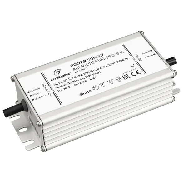 Источник напряжения с гальванической развязкой для светодиодных изделий. Предназначен для работы в условиях Крайнего Севера с запуском до -55С. Входное напряжение 200-240 VAC. Выходные параметры: 24 В, 4 А, 96 Вт. Встроенный PFC >0.95. Герметичный алюминиевый корпус IP 67. Рабочая температура -55…+60C⁰. Габаритные размеры длина 158 мм, ширина 67.5 мм, высота 38.5 мм. Гарантийный срок 5 лет.