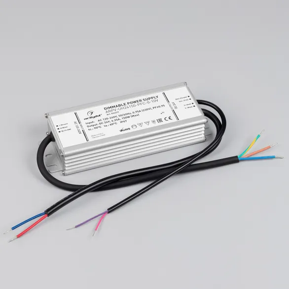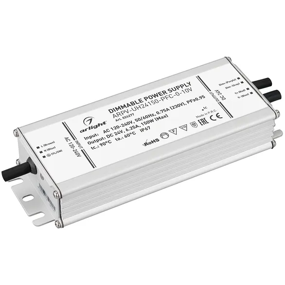 Диммируемый источник напряжения по стандарту 0/1-10 В с гальванической развязкой для светодиодных изделий. Входное напряжение 120-240 VAC. Выходные параметры: 24 В, 6.3А, 150 Вт. Встроенный PFC >0.95. Герметичный алюминиевый корпус IP 67. Рабочая температура -40…+60C⁰. Габаритные размеры длина 188 мм, ширина 67.5 мм, высота 33.5 мм. Гарантийный срок 7 лет.