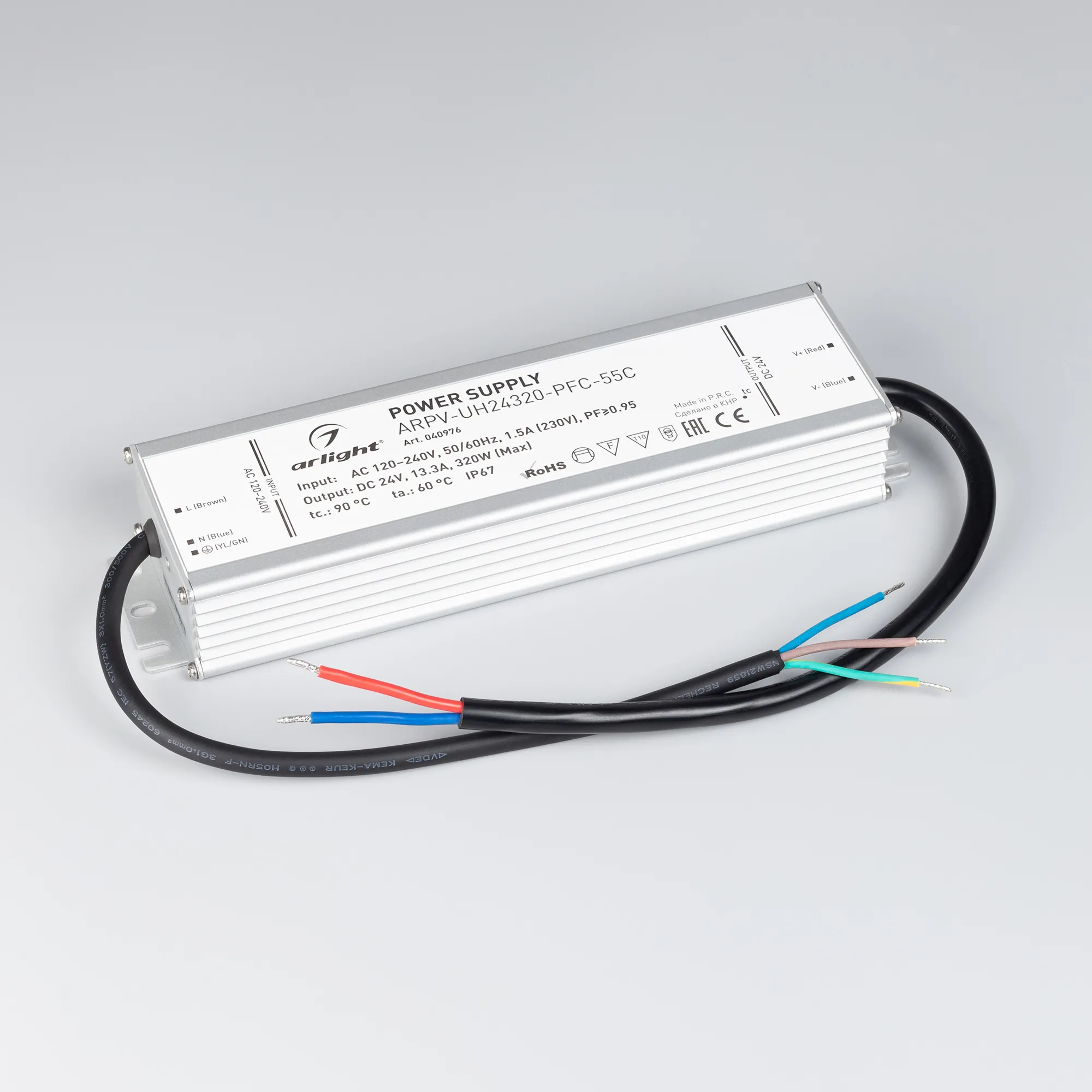 Источник напряжения с гальванической развязкой для светодиодных изделий. Предназначен для работы в условиях Крайнего Севера с запуском до -55С. Входное напряжение 120-240 VAC. Выходные параметры: 24 В, 13.3 А, 320 Вт. Встроенный PFC >0,95. Герметичный алюминиевый корпус IP 67. Рабочая температура -55…+60C⁰. Габаритные размеры длина 251 мм, ширина 68 мм, высота 38.5 мм. Гарантийный срок 5 лет.