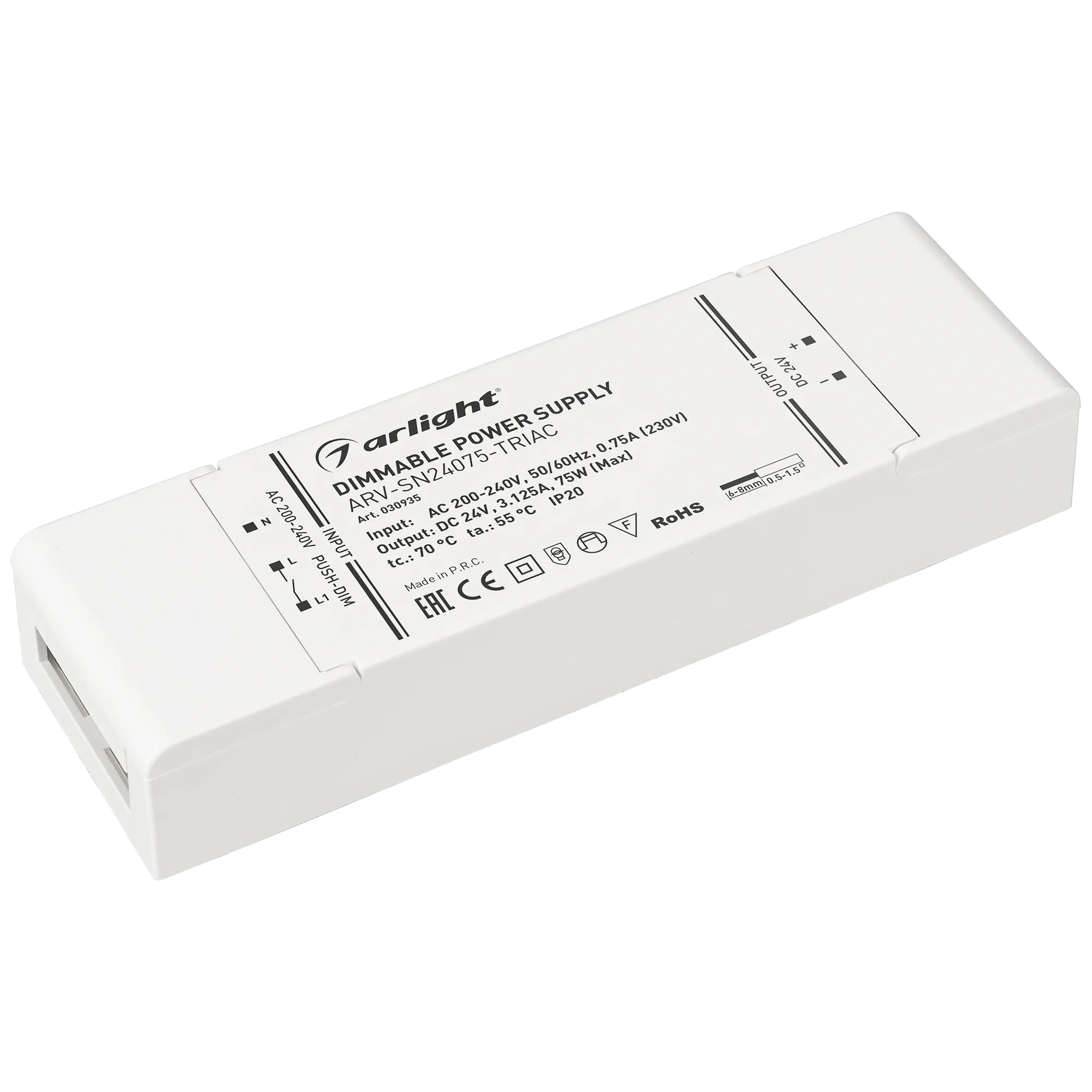 Блок питания 24V с гальванической развязкой, ток 3,125А, 75 Вт, с управлением от симисторного настенного диммера (TRIAC) и/или с помощью функции Push-dim, без корректора мощности. Рекомендуется для использования с настенными диммерами типа RL (резистивная нагрузка, Leading edge). Пластиковый корпус IP20. Вход: 200-240VAC. Выход: 24VDC 3.125A. Размер 179х56х30 mm. Гарантия 3 года.
