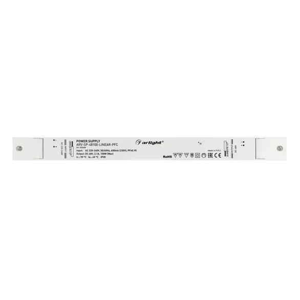 Источник напряжения с гальванической развязкой для светодиодных изделий. Входное напряжение 220-240 VAC. Выходные параметры: 48 В, 2.1 А, 100 Вт. Встроенный PFC >0,95. Негерметичный пластиковый корпус IP 20. Габаритные размеры длина 350 мм, ширина 30 мм, высота 18 мм. Гарантийный срок 5 лет.