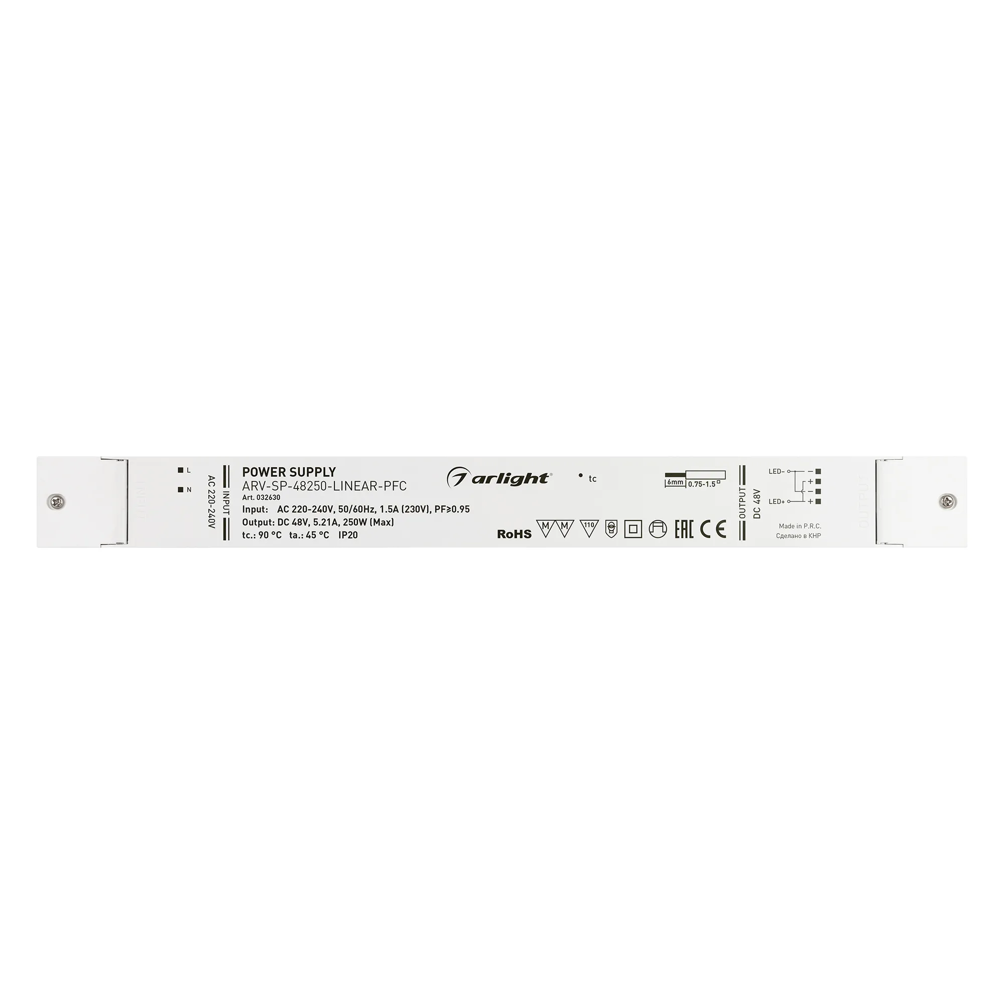 Источник напряжения с гальванической развязкой для светодиодных изделий. Входное напряжение 220-240 VAC. Выходные параметры: 48 В, 5.21 А, 250 Вт. Встроенный PFC >0,95. Негерметичный пластиковый корпус IP 20. Габаритные размеры длина 400 мм, ширина 40 мм, высота 22 мм. Гарантийный срок 5 лет.