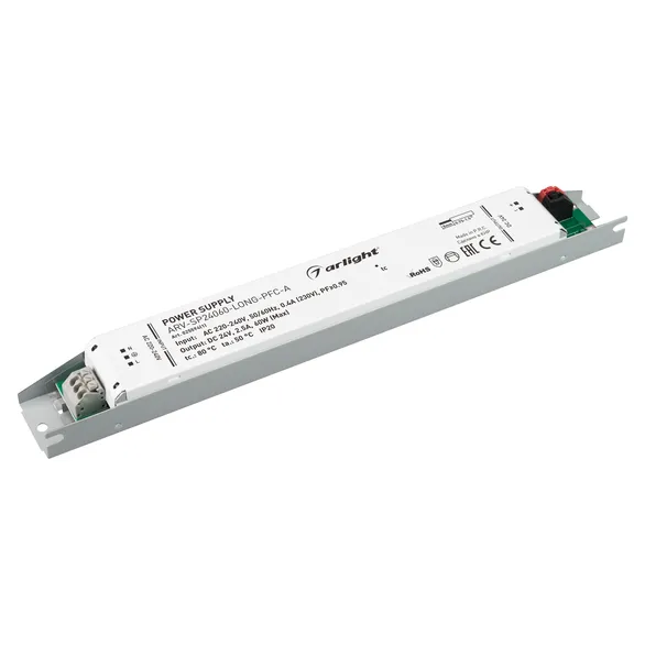 Источник напряжения с гальванической развязкой для светодиодных изделий. Входное напряжение 220-240 VAC. Выходные параметры: 24 В, 2.5 А, 60 Вт. Встроенный PFC >0.95. Негерметичный алюминиевый корпус IP 20. Габаритные размеры длина 250 мм, ширина 30 мм, высота 21 мм. Гарантийный срок 5 лет.