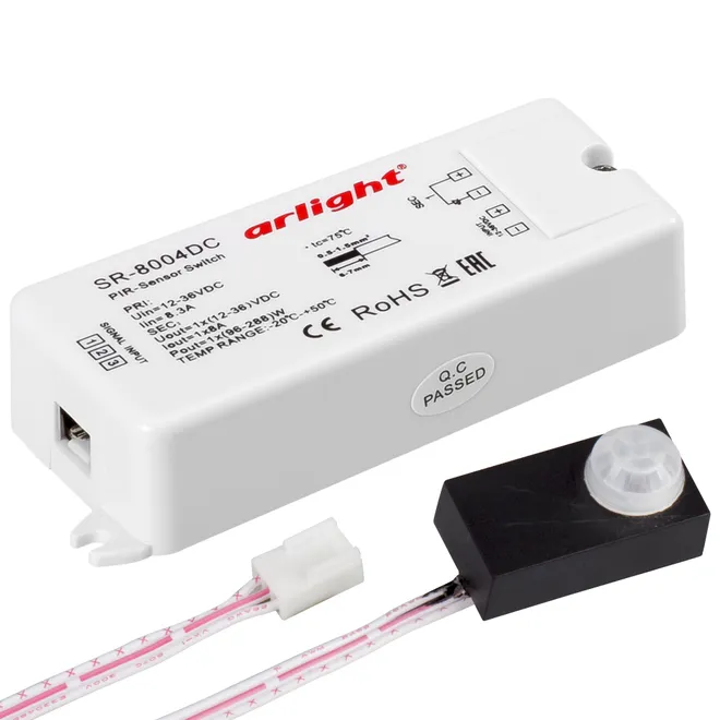 Датчик SR-8004-DC black (12-36V, 96-288W, PIR-Sensor) предназначен для бесконтактного включения и выключения светодиодных лент и др. источников света с напряжением питания 12/24/36 В и мощностью до 96/192/288 Вт. Благодаря компактным размерам датчик легко монтируется накладным способом на поверхность мебели, полки, стены. Блок управление расположен отдельно от датчика и имеет размеры 95×37×20 мм, длина провода составляет 1м. Включение света происходит при улавливании движения в зоне чувствительности (радиус зоны до 3 м), а отключение через 50 сек после пропадания движения. Отличное решение при организации подсветки в гардеробных комнатах, коридорах, подсобных помещениях, совместим с мебельными светильниками Arlight. Продлевает срок службы источников света, снижая затраты на электроэнергию.