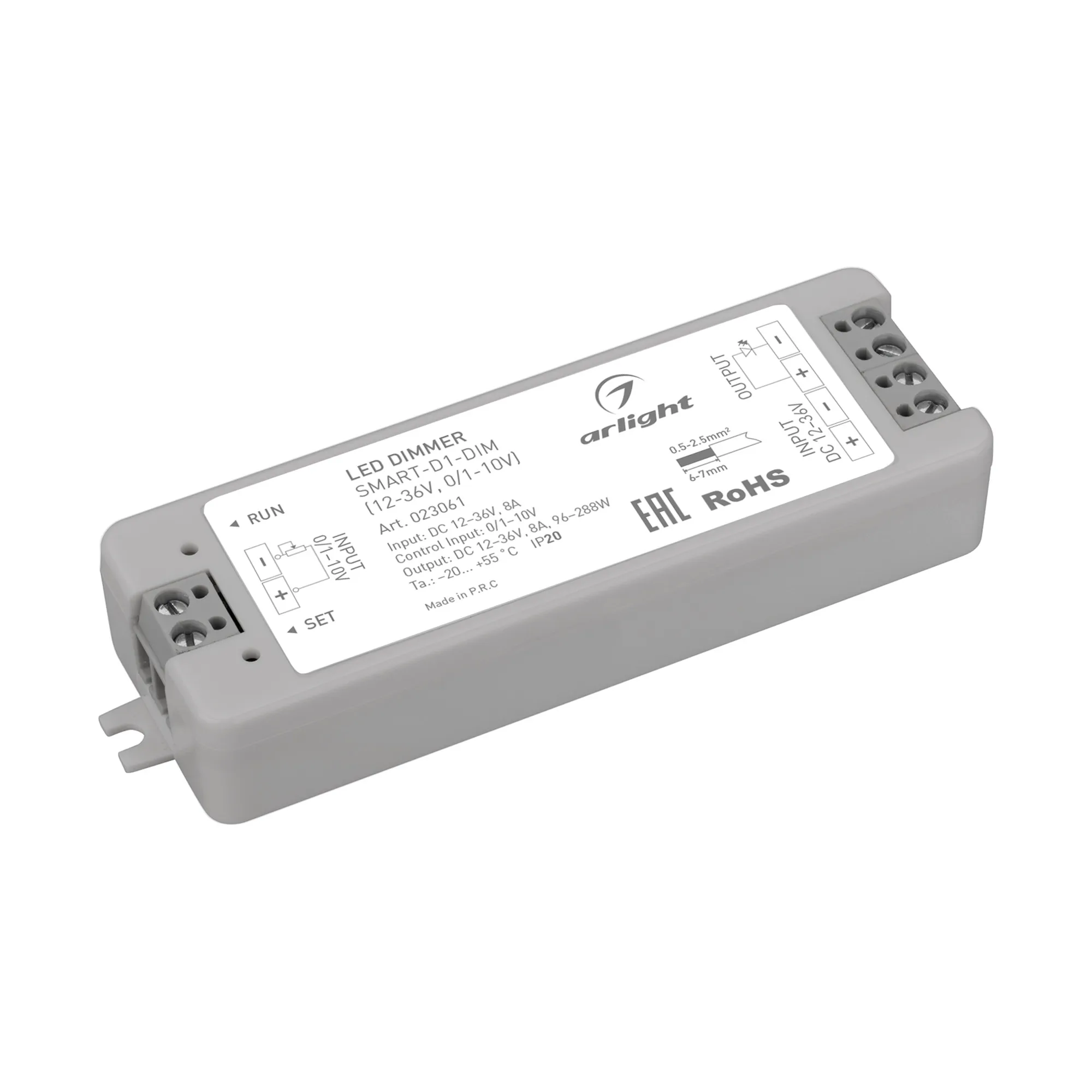 Диммер для одноцветных источников света (0/1-10V). Питание/рабочее напряжение 12-36VDC, входной/выходной ток 8А, выходная мощность 96-288W. Корпус - PVC. Габариты 97х33х18 мм.