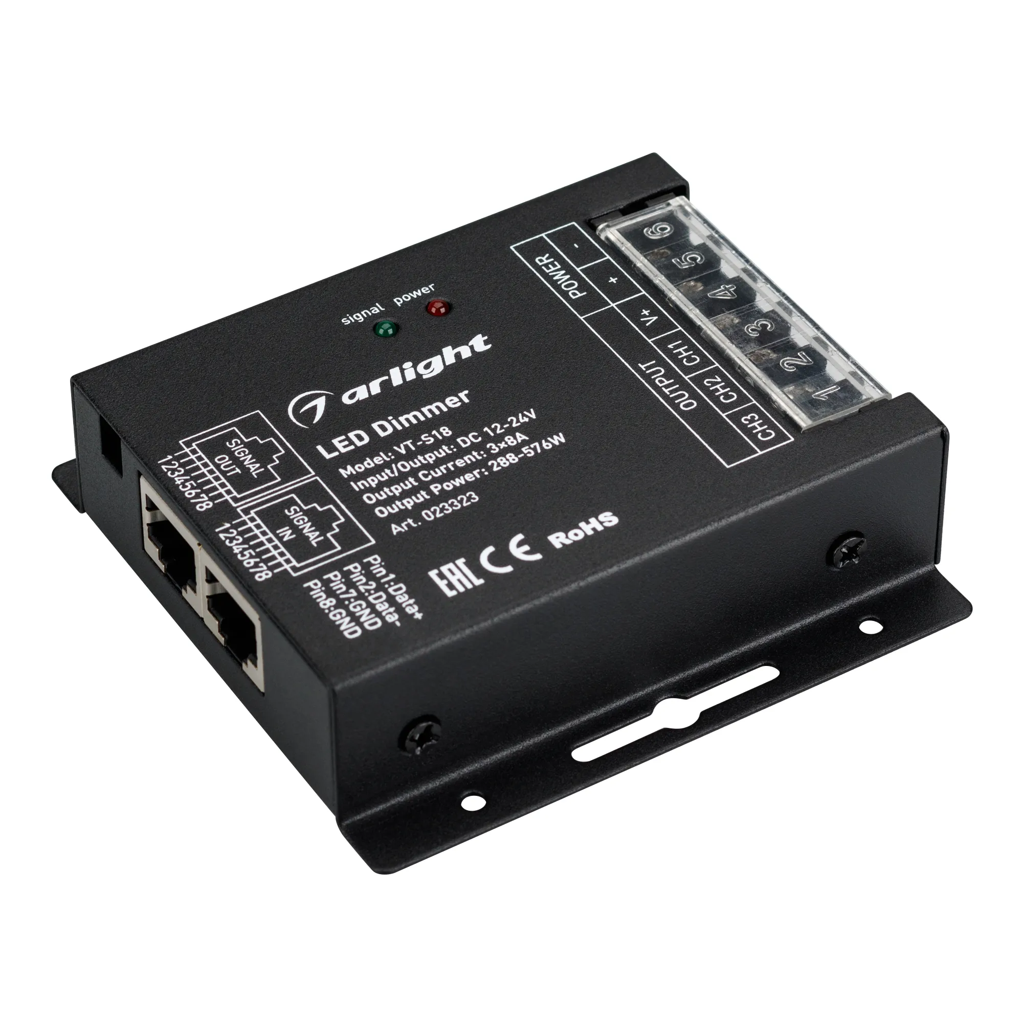Комплект: 3-канальный диммер со стильным радиопультом черного цвета с 12 кнопками, для управления одноцветной светодиодной лентой. Этот комплект устройств позволит легко и удобно регулировать яркость освещения, осуществлять включение и выключение света, включать динамические программы и регулировать их скорость. Питание диммера имеет диапазон напряжений от 12В до 24В, максимальный ток 8А на 1 канал, максимальная мощность 288-576Вт (в зависимости от напряжения питания). Возможно параллельное (синхронное) управление 3-мя каналами. Диммер имеет порты RJ45 для возможности проводного соединения устройств между собой и синхронизации их работы. При потере питания диммера последнее состояние яркости сохраняется. Питание пульта осуществляется от 2-х батареек ААА. Габариты диммера составляют 90x90x25мм, габариты пульта составляют 150х40х20мм.
