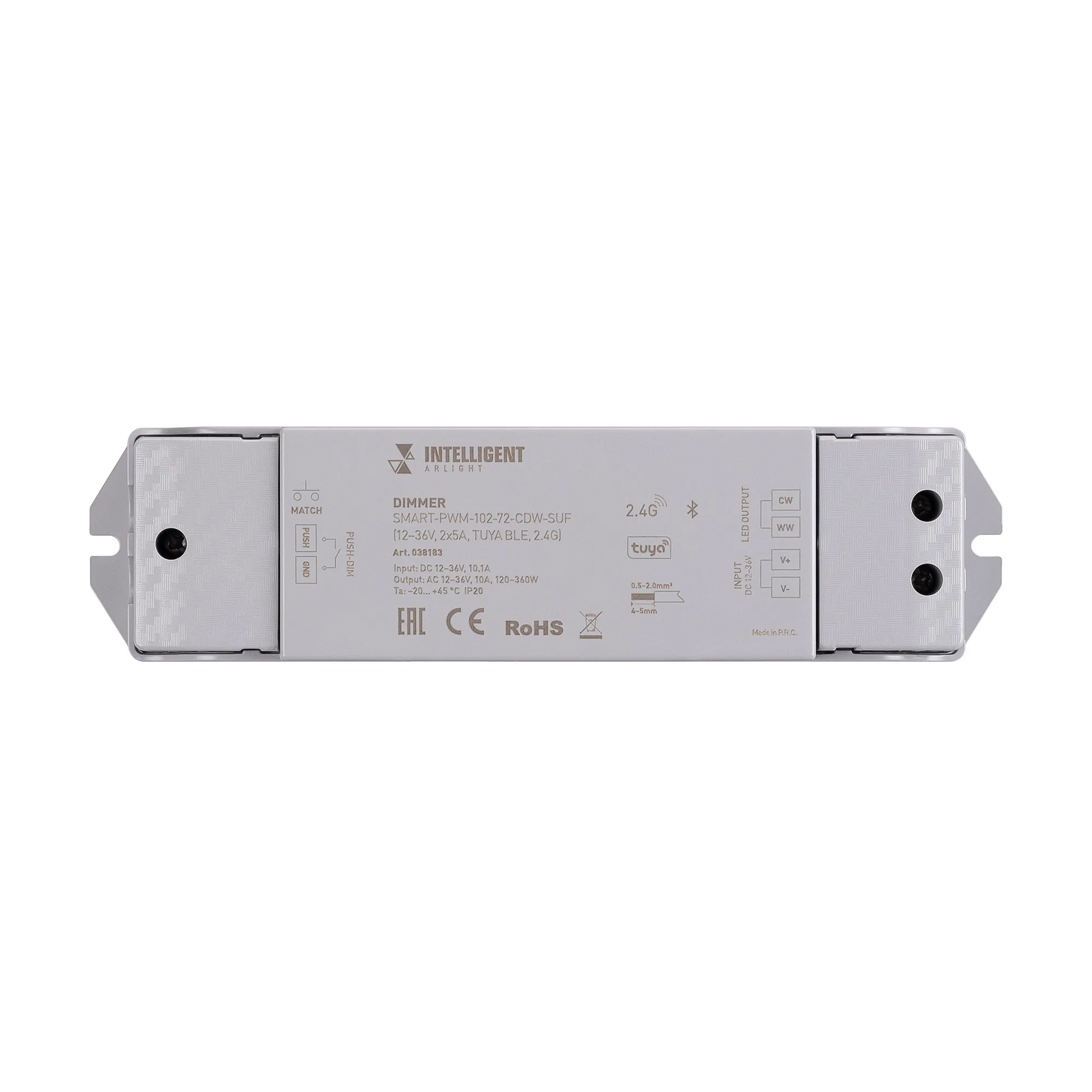 Контроллер для светодиодной биполярной CDW ленты (2 провода), управляемый по 2.4G+Bluetooth (SIG MESH), интерфейс TUYA, совместим с приложением INTELLIGENT ARLIGHT. Питание/рабочее напряжение 12-36VDC, максимальный ток 5A на канал, 2 канала, максимальная мощность 120-360W на канал. Винтовые клеммы. Корпус - PVC. Габариты 175x45x27 мм. Контроллер работает только с биполярными лентами, в том числе, лентами CDW. Управляется пультами и панелями серии SMART (поставляются отдельно).