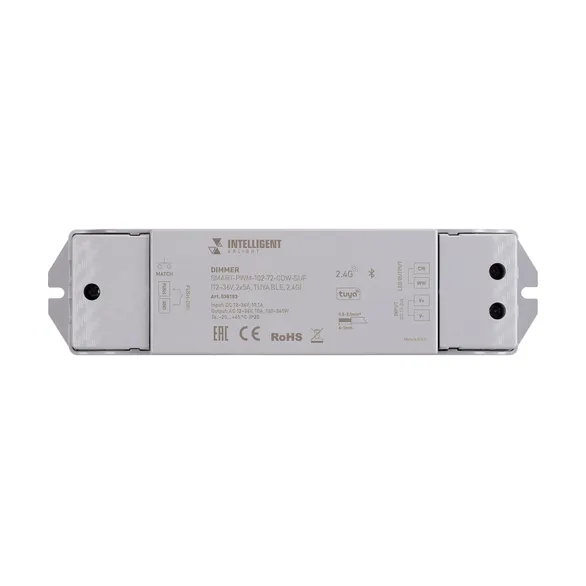 Диммер для управления биполярными светодиодными лентами (CDW) с напряжением питания 12-36В, поддерживающими диммирование ШИМ. Выполняет основные функции: включение/выключение, регулировка яркости и цветовой температуры. Устройство совместимо с радиочастотными пультами дистанционного управления и настенными панелями управления серии SMART. Может выступать в качестве конвертера Wi-Fi в RF. Позволяет синхронно управлять одним или несколькими диммерами и контроллерами серии SMART с помощью мобильных устройств. Управление со смартфона реализовано в приложении Smart Life (Android/iOS).