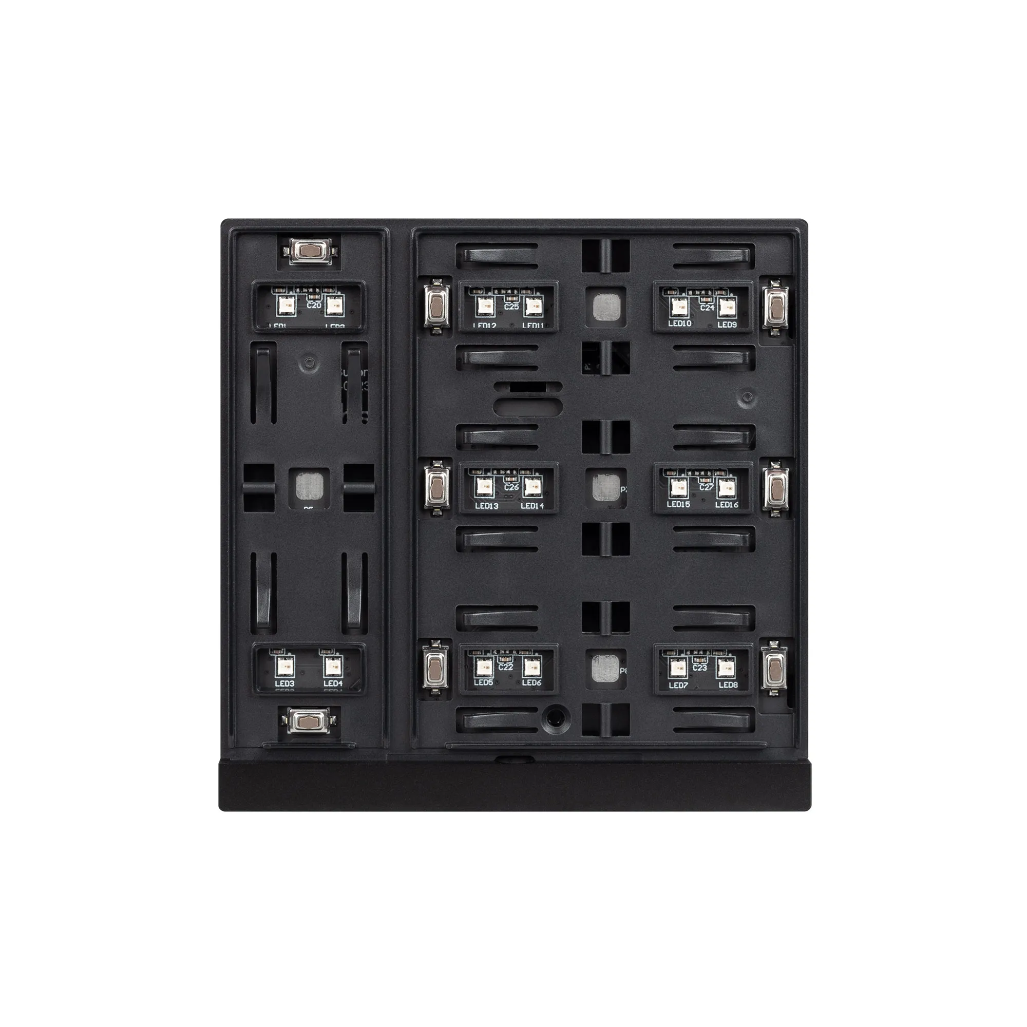 Механизм встраиваемой панели черного цвета с кнопочным управлением, предназначенная для включения и выключения световых сцен в системах управления светом KNX. Позволяет осуществлять включение/выключение, диммирование, управление шторами и жалюзи, управлять сценами. Поддерживает управление с помощью 4 настраиваемых рокерных клавиш. Каждая клавиша может выполнять функции 2-х клавиш. Устройство совместимо с исполнительными устройствами стандарта KNX, в том числе, мировых производителей ABB, SCHNEIDER ELECTRIC, SIEMENS, ZENNIO и другими. Удобное и точное управление при помощи отдельных механических кнопок для каждой функции. Питание от шины KNX. Габариты устройства составляют 86x86x33 мм, установка в стандартную монтажную коробку. Пластиковый корпус, цвет черый, безрамочный корпус, материал - пластик, светодиодная индикация.