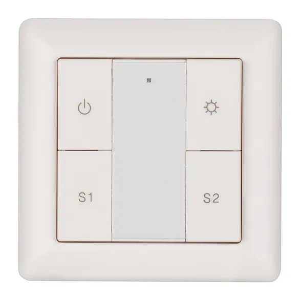 Встраиваемая пластиковая панель белого цвета с кнопочным управлением, предназначенная для управления одноцветными светодиодными лентами, светильниками и другими источниками света в системах управления светом DALI. Позволяет включать/выключать свет в одной группе, менять его яркость, сохранять и вызывать до 2 световых сцен. Установка номера группы и сцен выполняется переключателями на задней стороне панели. Устройство совместимо с диммерами стандарта DALI. Передача команд от панели к диммерам выполняется по общей двухпроводной шине DALI. Удобное и точное управление при помощи отдельных механических кнопок для каждой функции. Питание от шины DALI. Габариты устройства составляют 81х81х22.5 мм. Панель совместима с декоративными рамками ведущих мировых производителей (GIRA, JUNG, BERKER, MERTEN). Стандартная рамка входит в комплект поставки.