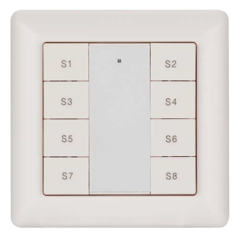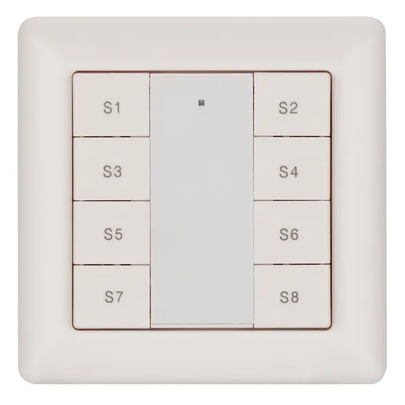 Встраиваемая пластиковая панель белого цвета с кнопочным управлением, предназначенная для включения и выключения световых сцен в системах управления светом DALI. Позволяет включать/выключать световые сцены в одной группе или для всех подключенных исполнительных устройств (Broadcast). Установка номера группы и сцен выполняется переключателями на задней стороне панели. Поддерживает управление 8 сценами. Устройство совместимо с диммерами стандарта DALI. Передача команд от панели к диммерам выполняется по общей двухпроводной шине DALI. Удобное и точное управление при помощи отдельных механических кнопок для каждой функции. Питание от шины DALI. Габариты устройства составляют 81х81х22.5 мм, установка в стандартную монтажную коробку. Панель совместима с декоративными рамками ведущих мировых производителей (GIRA, JUNG, BERKER, MERTEN). Стандартная рамка входит в комплект поставки.