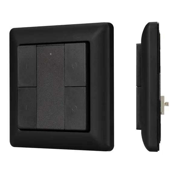 Встраиваемая кнопочная пластиковая панель черного цвета, предназначенная для включения/выключения и управления яркостью одноцветных светодиодных лент, светильников и других источников света по двухпроводной шине DALI. Количество групп управления: 2 группы / Broadcast + 1 группа. Управление источниками света осуществляется при помощи диммеров DALI. Установка номера группы или режима Broadcast выполняется переключателем на задней стороне панели. Габариты устройства составляют 81х81х22.5 мм. Панель совместима с декоративными рамками ЭУИ ведущих мировых производителей. Стандартная рамка входит в комплект поставки.