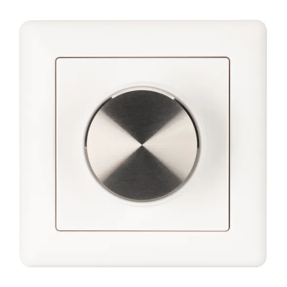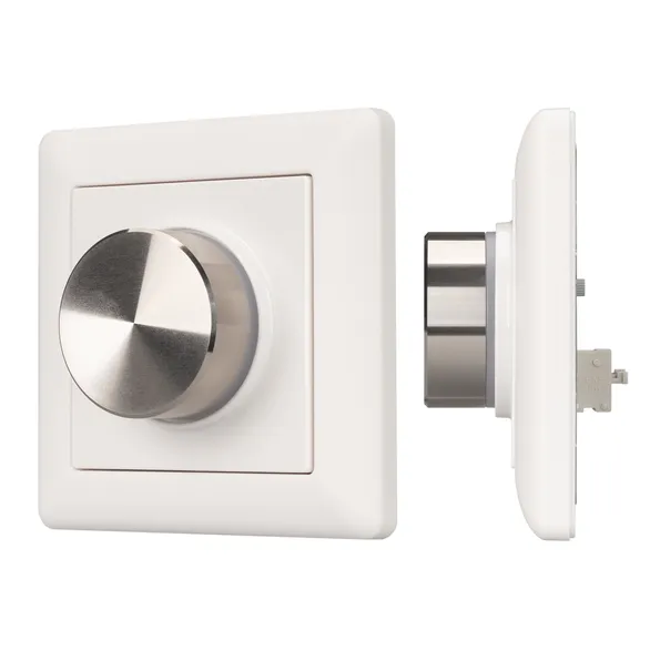Встраиваемая пластиковая панель белого цвета с роторным вращателем (потенциометром), предназначенная для управления светодиодным или любым другим осветительным оборудованием, работающим в протоколе DALI. С помощью панели осуществляется регулировка яркости, включение/выключение света и управление цветом свечения. Панель совместима с любыми двухканальными (MIX) исполнительными устройствами стандарта DALI DT8. Установка номера группы или режима Broadcast выполняется переключателем на задней стороне панели. Питание устройства осуществляется от шины DALI, тип устройства DALI DT6. Установка адреса управления выполняется переключателями на корпусе. Габариты устройства составляют 81х81х40 мм, подсветка регулятора во включенном состоянии, установка в стандартный подрозетник. Панель совместима с декоративными рамками ведущих мировых производителей (GIRA, JUNG, BERKER, MERTEN). Стандартная рамка входит в комплект поставки.