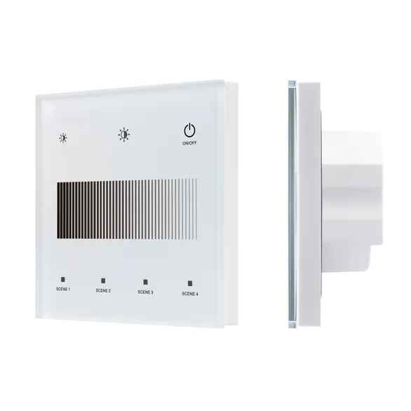 Встраиваемая стеклянная сенсорная панель белого цвета, предназначенная для управления одноцветным освещением в системах DALI. Позволяет включать/выключать свет и менять его яркость по 1 адресу, группы или в режиме Broadcast с помощью сенсорной полосы, сохранять и вызывать до 4 световых сцен. Установка адреса и выбор режима выполняется переключателями на задней стороне корпуса панели. Устройство совместимо с диммерами стандарта DALI. Передача команд от панели к диммерам выполняется по общей двухпроводной шине DALI. Удобное и точное управление при помощи слайдера и сенсорных кнопок. Питание от шины DALI, либо от источника питания 24В. Устройство совместимо с радиочастотными пультами 2.4GHz серии SMART. Габариты составляют 86x86x34.5 мм, установка в стандартную монтажную коробку.
