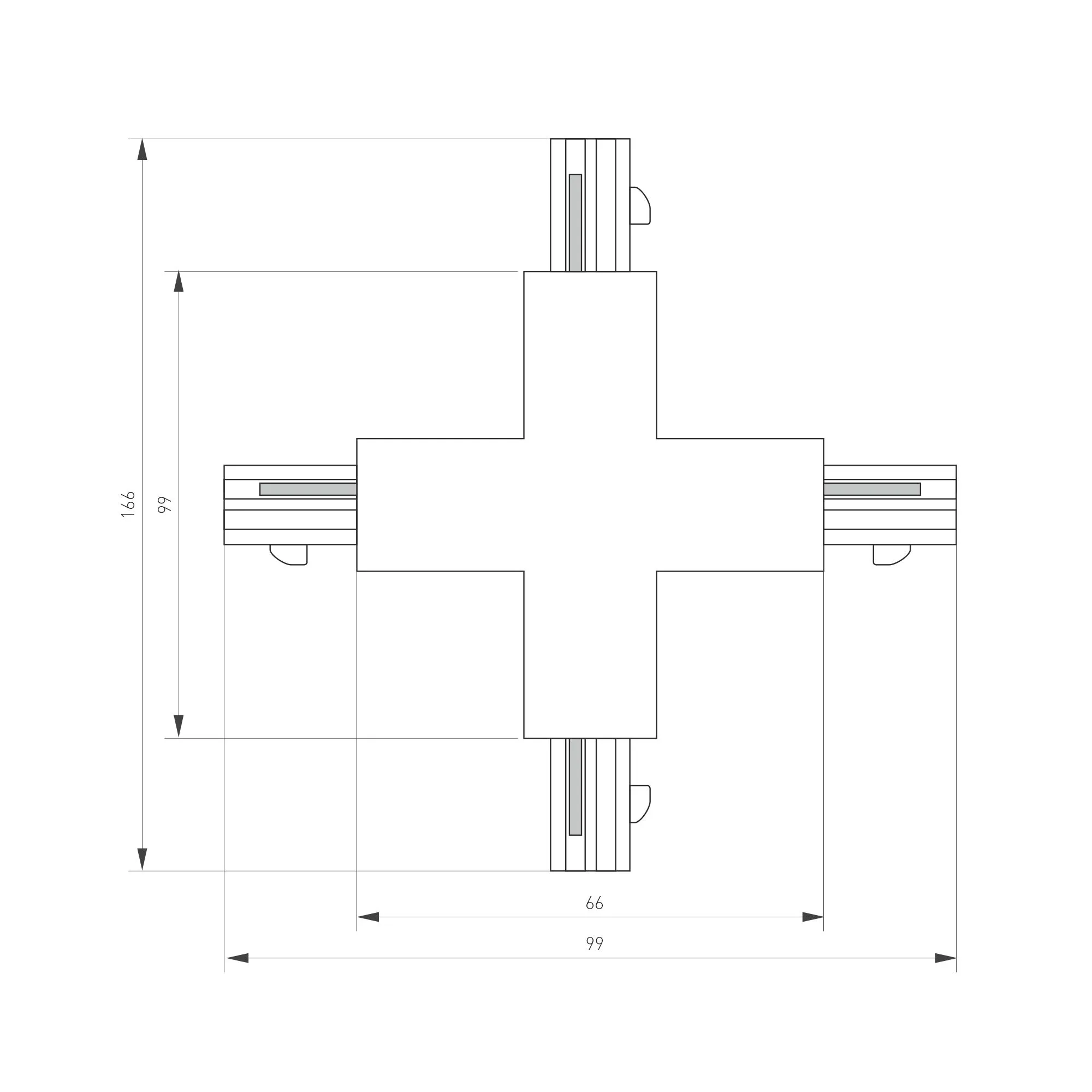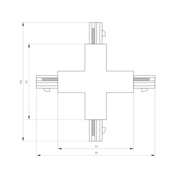 X-образный коннектор для треков 4TR. Цвет белый. 166х166х33 мм с контактами, 99х99х33 мм без контактов.