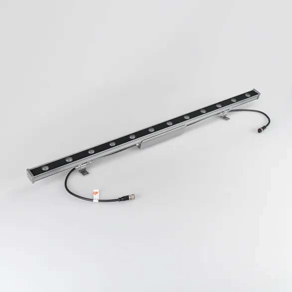 Линейный прожектор. Мощность 12 Вт, св. поток 1000 лм, 83 лм/Вт, дневной 4000 K, CRI>80, угол 15x60°, напряжение питания 230 В. Серый прямоугольный корпус из алюминия, экран стекло, степень защиты IP65. Размер: длина 1000 мм, ширина 40 мм, высота 30 мм. Монтаж на кронштейнах.