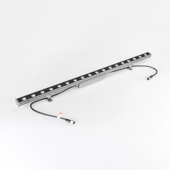Линейный прожектор. Мощность 18 Вт, св. поток 1425 лм, 79 лм/Вт, тёплый 3000 K, CRI>80, угол 15x60°, напряжение питания 230 В. Серый прямоугольный корпус из алюминия, экран стекло, степень защиты IP65. Размер: длина 1000 мм, ширина 40 мм, высота 30 мм. Монтаж на кронштейнах.