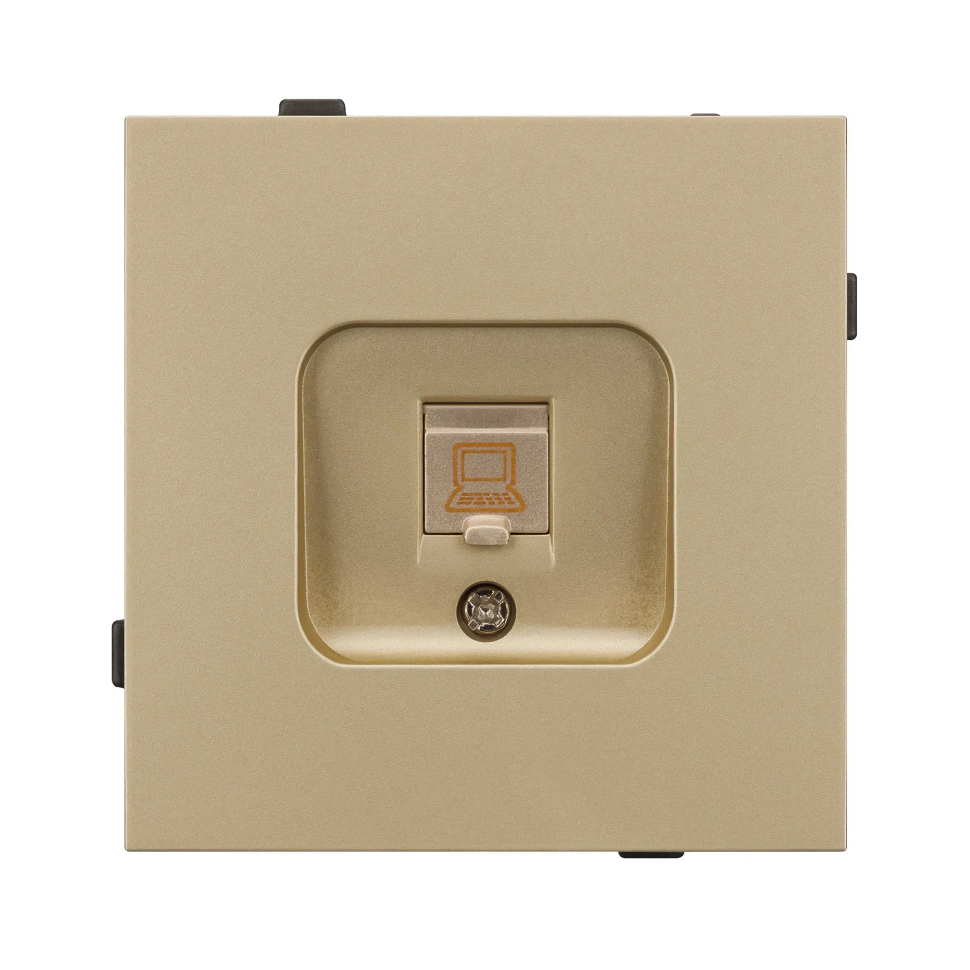 Механизм компьютерной розетки совместим с рамками серии TENDO, создает утонченный минималистичный вид. Скрытый тип монтажа позволяет гармонично встроить в интерьер любого современного дизайн-проекта. Видимая часть механизма выполнена из высококачественного пластика золотого цвета и имеет Soft-Touch покрытие, что придает изделию приятные тактильные ощущения и стильный внешний вид.