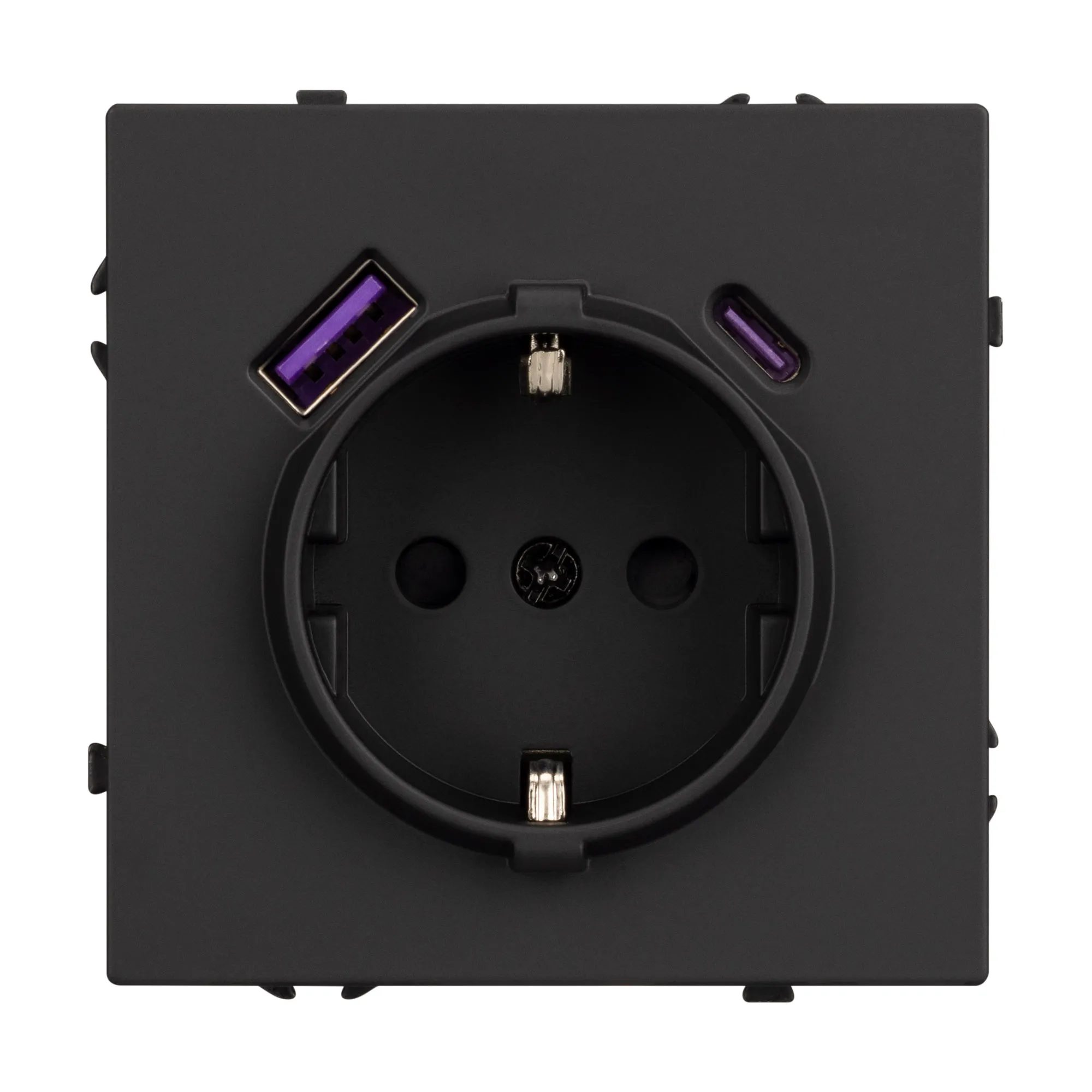 Механизм розетки с заземлением 1 пост и 2 USB Type A+C порта. Цвет - черный, с Soft-Touch покрытием. Без фронтальной рамки. Уровень пылевлагозащиты IP20. Розетка устанавливается в стандартный подрозетник круглого сечения диаметром 60мм.