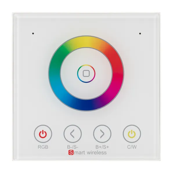 Настенная сенсорная панель со стекляным покрытием предназначена для встройки в стандартный подрозетник. С помощью панели возможно управление 4-х канальной мультицветной RGBW светодиодной лентой - включение/выключение, регулировка яркости, изменение цвета. Панель имеет сенсорный круг для точного и легкого изменения цвета свечения, кнопки включения и выключения света. Изделие выполнено в белом цвете из высококачественного стекла, устойчивого к появлению мелких царапин и сколов. Питание панели имеет диапазон напряжений от 12В до 24В, максимальный ток 4А на 1 канал, максимальная мощность 192-384Вт (в зависимости от напряжения питания). Габариты панели составляют 89х89х40мм.