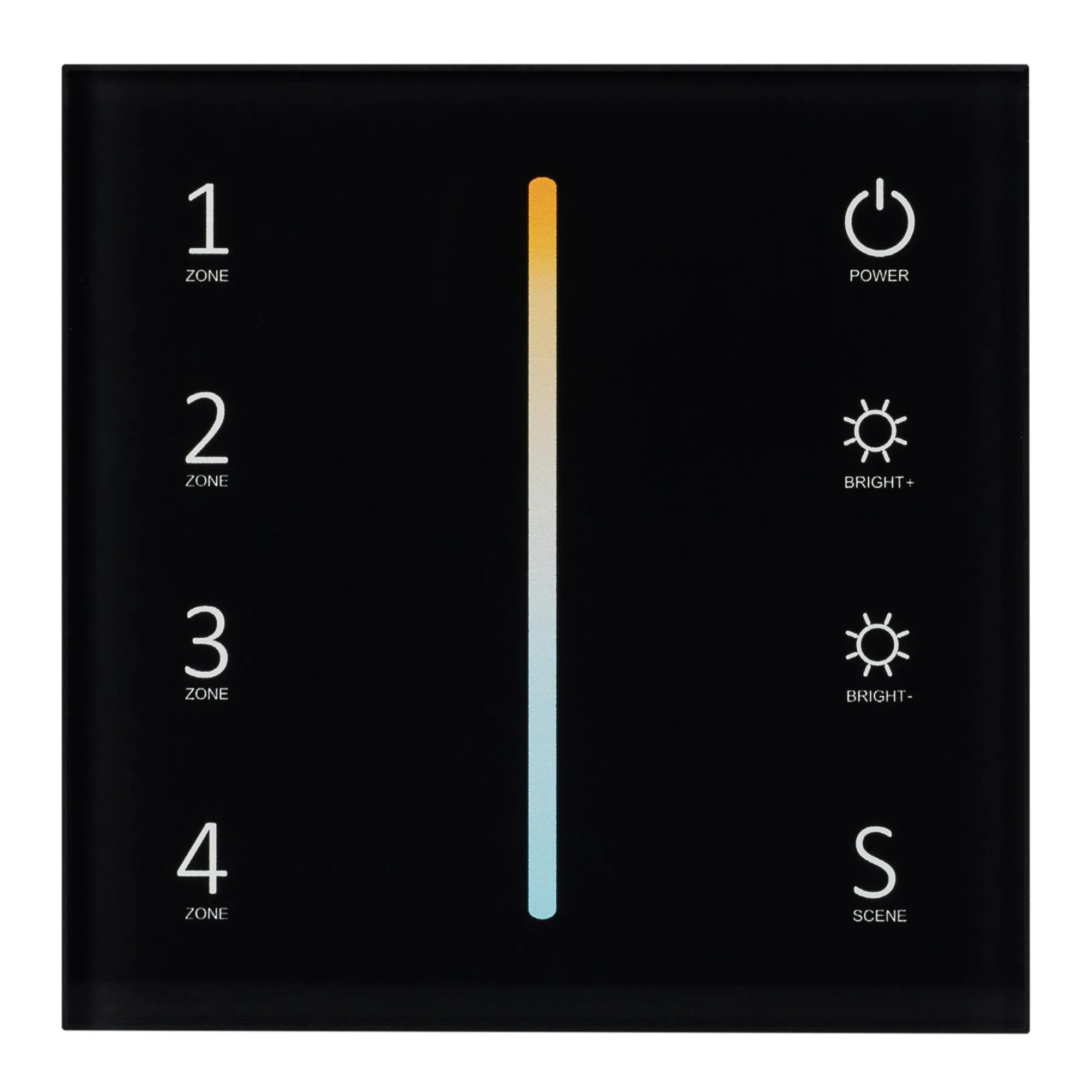 Встраиваемая сенсорная панель, изготовленная из высококачественного стекла, защищенного от появления царапин. Изделие позволяет осуществлять основные функции управления светом: включение/выключение, регулировка яркости, регулировка цветовой температуры, сохранение предустановок для 4 световых зон. Панель совместима с диммерами и контроллерами SMART по радиоканалу 2.4G (количество привязываемых диммеров и контроллеров не ограничено) и может управлять DMX-диммерами по проводной шине DMX512. Выходной сигнал DMX соответствует стандартному протоколу DMX512 и совместим с оборудованием DMX любого производителя. Панель чёрного цвета, питание от сети 230В. Габариты устройства 86х86х36 мм, встраивается в стандартную монтажную коробку.