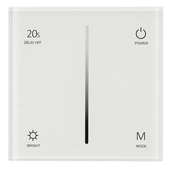 Встраиваемая сенсорная панель белого цвета, предназначенная для управления светодиодными или другими источниками света с напряжением питания 230В. Панель позволяет включать и выключать свет и регулировать его яркость. Удобное и точное управление при помощи сенсорной полосы и сенсорных кнопок. Стильный и современный дизайн, позволяющий устанвливать панель в большинство типов подрозетников и сочетающийся с большинством интерьеров. Панелью можно управлять пультами ДУ и другими панелями серии SMART по радиоканалу 2.4G. Возможна привязка до 10 пультов или панелей управления. Питание 230В, максимальный выходной ток 1.2А, максимальная мощность 288 Вт, максимальная мощность для электронной нагрузки 72 ВА. Габариты устройства 86х86х35 мм. Панель выполнена из стекла, устойчивого к появлению царарин и загрязнения. Устанавливается в стандартную монтажную коробку.