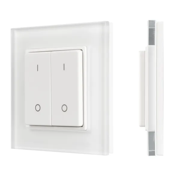 Накладная кнопочная панель 2.4 ГГц, цвет белый. Материал - стекло. Для управления одноцветными источниками света, 2 зоны управления. Питание/рабочее напряжение 3VDC от батарейки CR2025. Габариты 86х86х15 мм. Совместима с диммерами SMART.