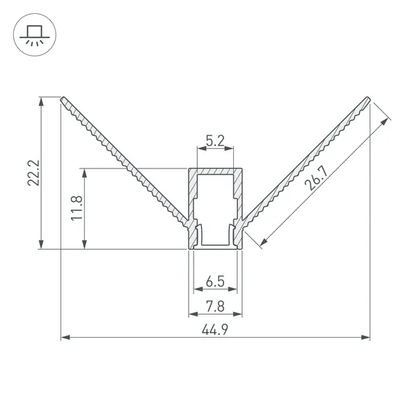 Габаритные размеры этого профиля составляют 2000 мм в длину, 44,9 мм в ширину и 22,2 мм в высоту. Площадка для установки светодиодных лент позволяет использовать ленту шириной до 5,2 мм и мощностью до 28 Вт/м. Это обеспечивает гибкость в выборе светодиодных лент и создает потрясающие световые решения.