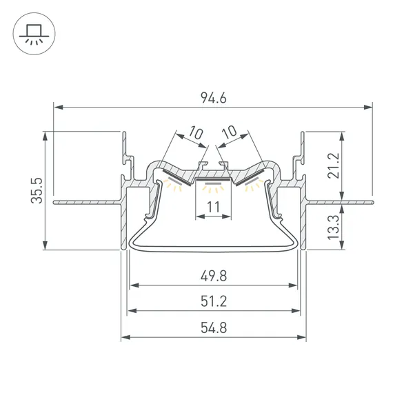 Габаритные размеры профиля составляют 2000 мм в длину, 95 мм в ширину и 36 мм в высоту. Площадки для установки светодиодных лент позволяют использовать ленты шириной до 10 мм и мощностью до 50 Вт/м (общая мощность для трех лент). Это обеспечивает гибкость в выборе светодиодных лент и создает потрясающие световые решения.