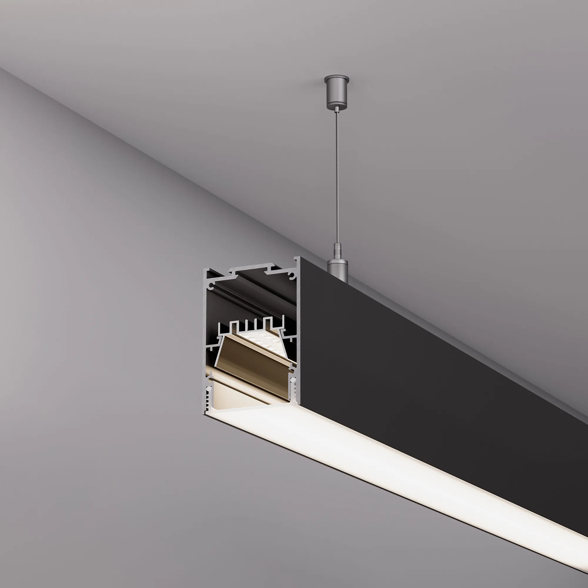 Подвесной профиль из алюминия черного цвета для основного освещения с возможностью герметизации до IP54 с помощью аксессуаров к профилю (уплотнительная резинка, заглушки, экраны, муфты) без дополнительного использования силиконового герметика, до IP65 с помощью аксессуаров к профилю (уплотнительная резинка, заглушки, экраны, муфты) при условии дополнительного использования силиконового герметика. Габаритные размеры профиля составляют 2000 мм в длину, 54,25 мм в ширину и 75 мм в высоту. Площадка для установки светодиодных лент позволяет использовать ленту шириной до 16 мм и мощностью до 36 Вт/м.