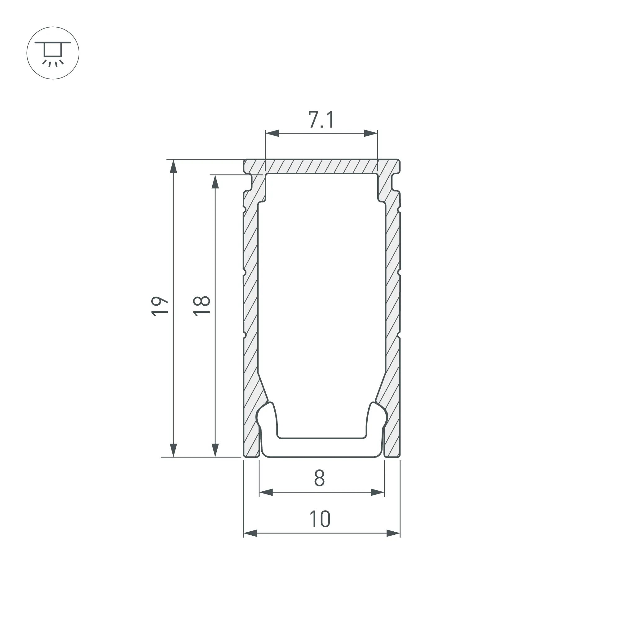 Накладной профиль из анодированного алюминия для подсветки мебели, пазов, ниш и других элементов интерьера. Габаритные размеры профиля составляют 2000 мм в длину, 10 мм в ширину и 19 мм в высоту. Площадка для установки светодиодных лент позволяет использовать ленту шириной до 7,1 мм и мощностью до 15,2 Вт/м.