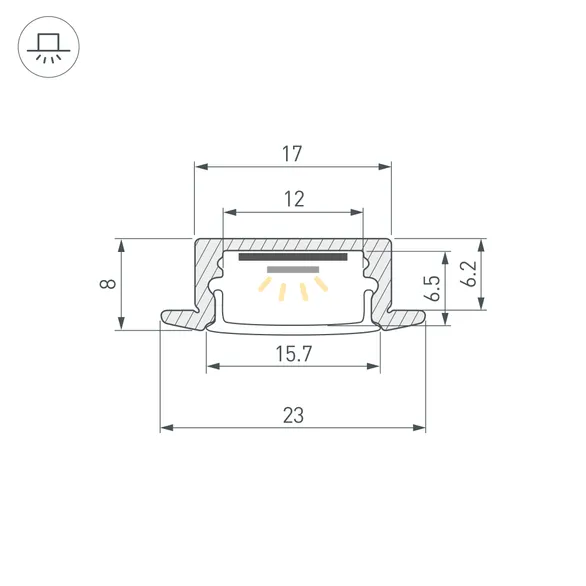 Встраиваемый профиль из алюминия белого цвета с накладным фланцем для контурной подсветки элементов интерьера. Габаритные размеры профиля составляют 2000 мм в длину, 23 мм в ширину и 8 мм в высоту. Площадка для установки светодиодных лент позволяет использовать ленту шириной до 12 мм и мощностью до 16 Вт/м. Это обеспечивает гибкость в выборе светодиодных лент и создает потрясающие световые решения.