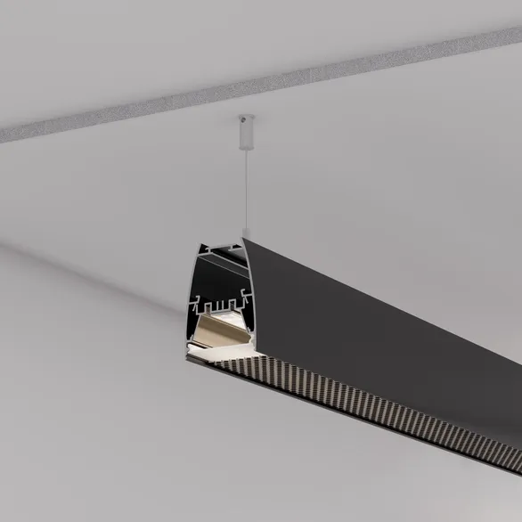 Подвесной/накладной профиль черного цвета из алюминия для основного освещения и контурной подсветки. Возможность установки антибликовой решетки Honeycomb поверх экрана позволяет получить более комфортное для глаз освещение.