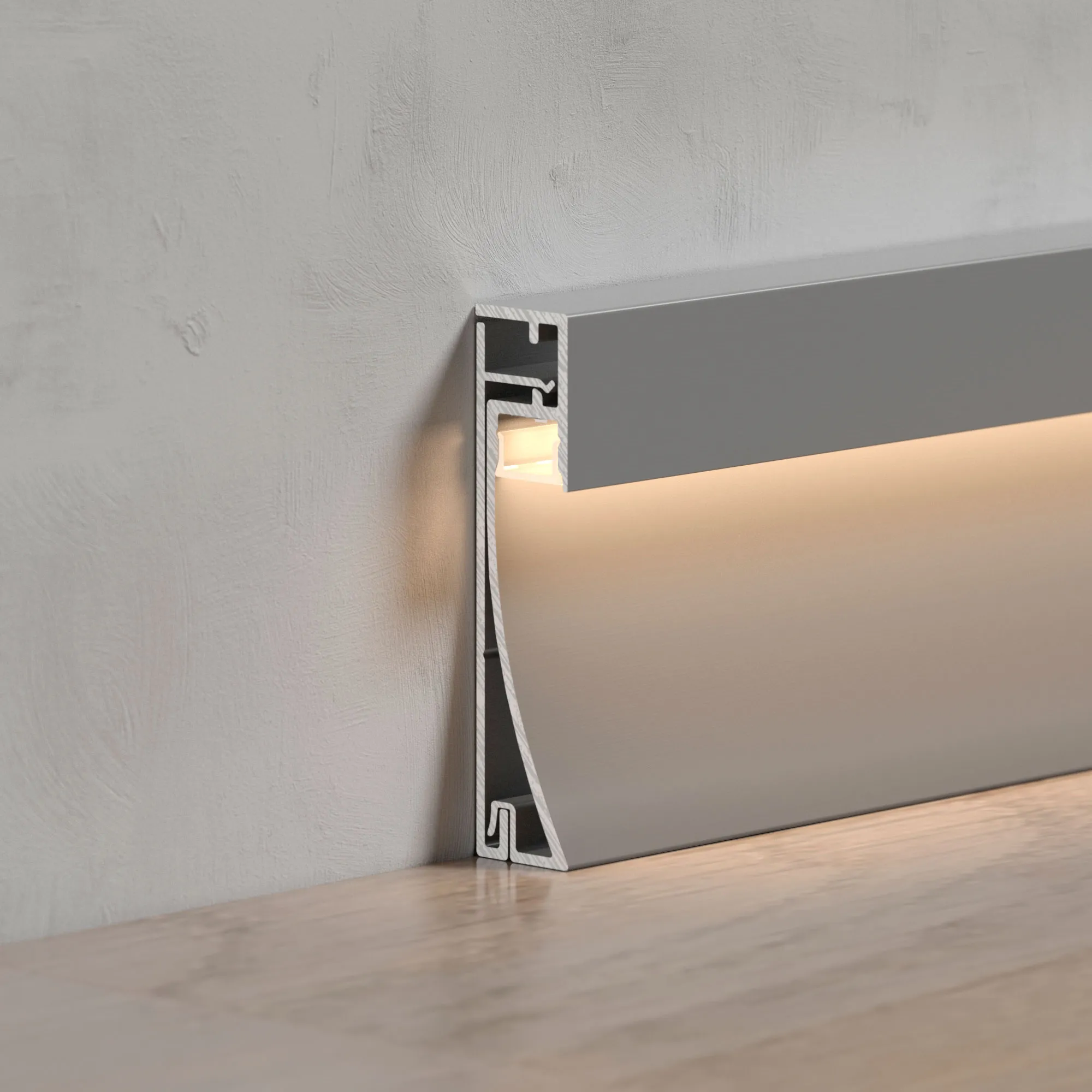 Накладной двухкомпонентный профиль-плинтус из анодированного алюминия для контурной подсветки помещения. Габаритные размеры профиля составляют 2000 мм в длину, 12,2 мм в ширину и 53,3 мм в высоту. Площадка для установки светодиодных лент позволяет использовать ленту шириной до 8 мм и мощностью до 20 Вт/м. Это обеспечивает гибкость в выборе светодиодных лент и создает потрясающие световые решения.