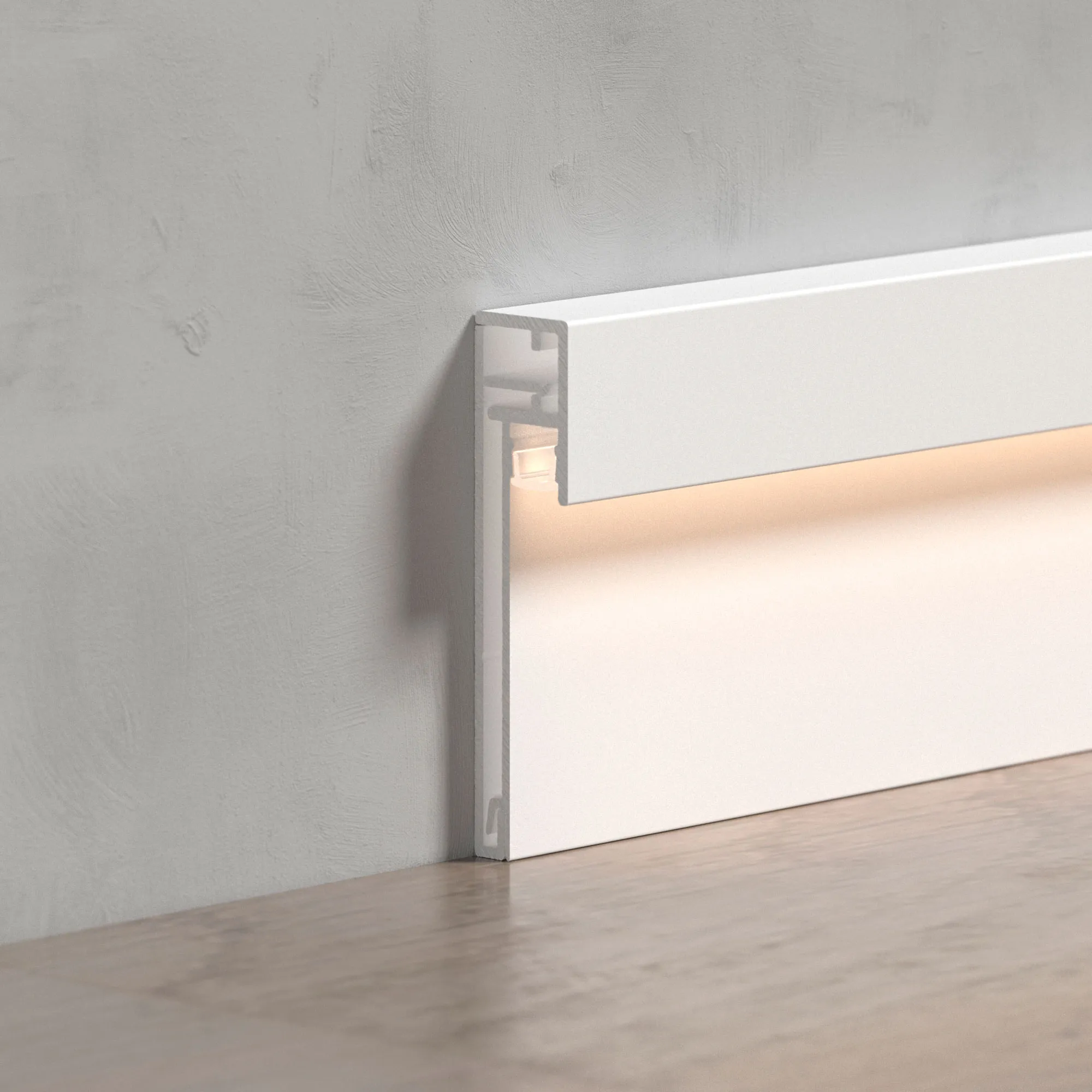 Накладной двухкомпонентный алюминиевый профиль-плинтус белого цвета для контурной подсветки помещения. Габаритные размеры профиля составляют 2000 мм в длину, 12,3 мм в ширину и 52,6 мм в высоту. Площадка для установки светодиодных лент позволяет использовать ленту шириной до 5 мм и мощностью до 20 Вт/м. Это обеспечивает гибкость в выборе светодиодных лент и создает потрясающие световые решения.