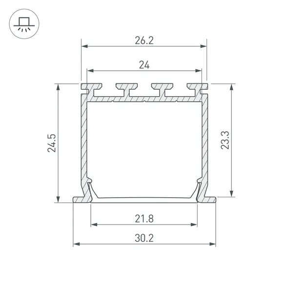 Алюминиевый анодированный встраиваемый профиль для светодиодных лент и линеек. Габаритные размеры (L×W×H): 2000x30x25 мм. Ширина площадки для ленты 24 мм. Экраны, заглушки и другие аксессуары приобретаются отдельно. Цена за 1 метр.