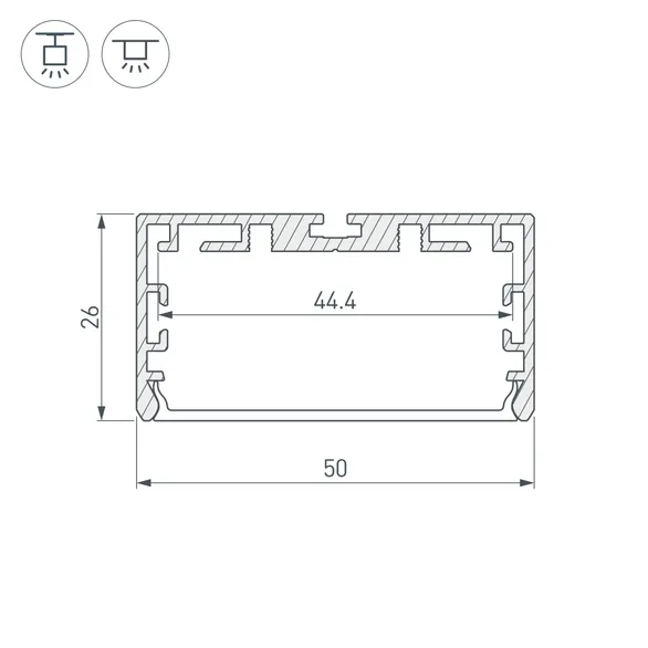 Габаритные размеры профиля составляют 2000 мм в длину, 50 мм в ширину и 26 мм в высоту. Площадка для установки светодиодных лент позволяет использовать ленту шириной до 44 мм и мощностью до 39,4 Вт/м. Это обеспечивает гибкость в выборе светодиодных лент и создает потрясающие световые решения.