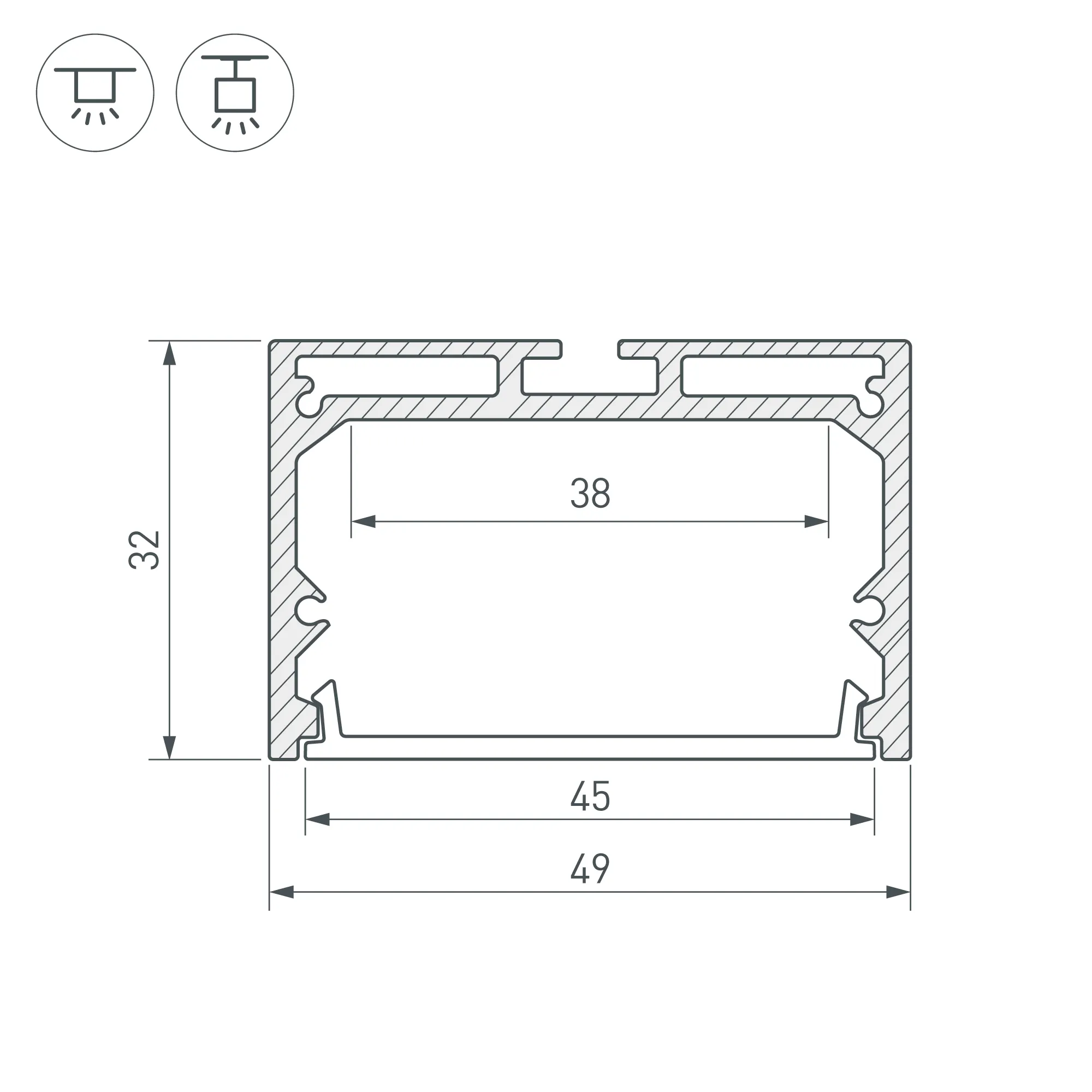 Габаритные размеры профиля составляют 2500 мм в длину, 49 мм в ширину и 32 мм в высоту. Площадка для установки светодиодных лент позволяет использовать ленту шириной до 38 мм и мощностью до 42,5 Вт/м. Это обеспечивает гибкость в выборе светодиодных лент и создает потрясающие световые решения.