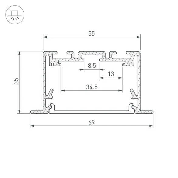 Габаритные размеры профиля составляют 2500 мм в длину, 69 мм в ширину и 35 мм в высоту. Площадка для установки светодиодных лент позволяет использовать ленту шириной до 34,5 мм и мощностью до 51 Вт/м. Это обеспечивает гибкость в выборе светодиодных лент и создает потрясающие световые решения.