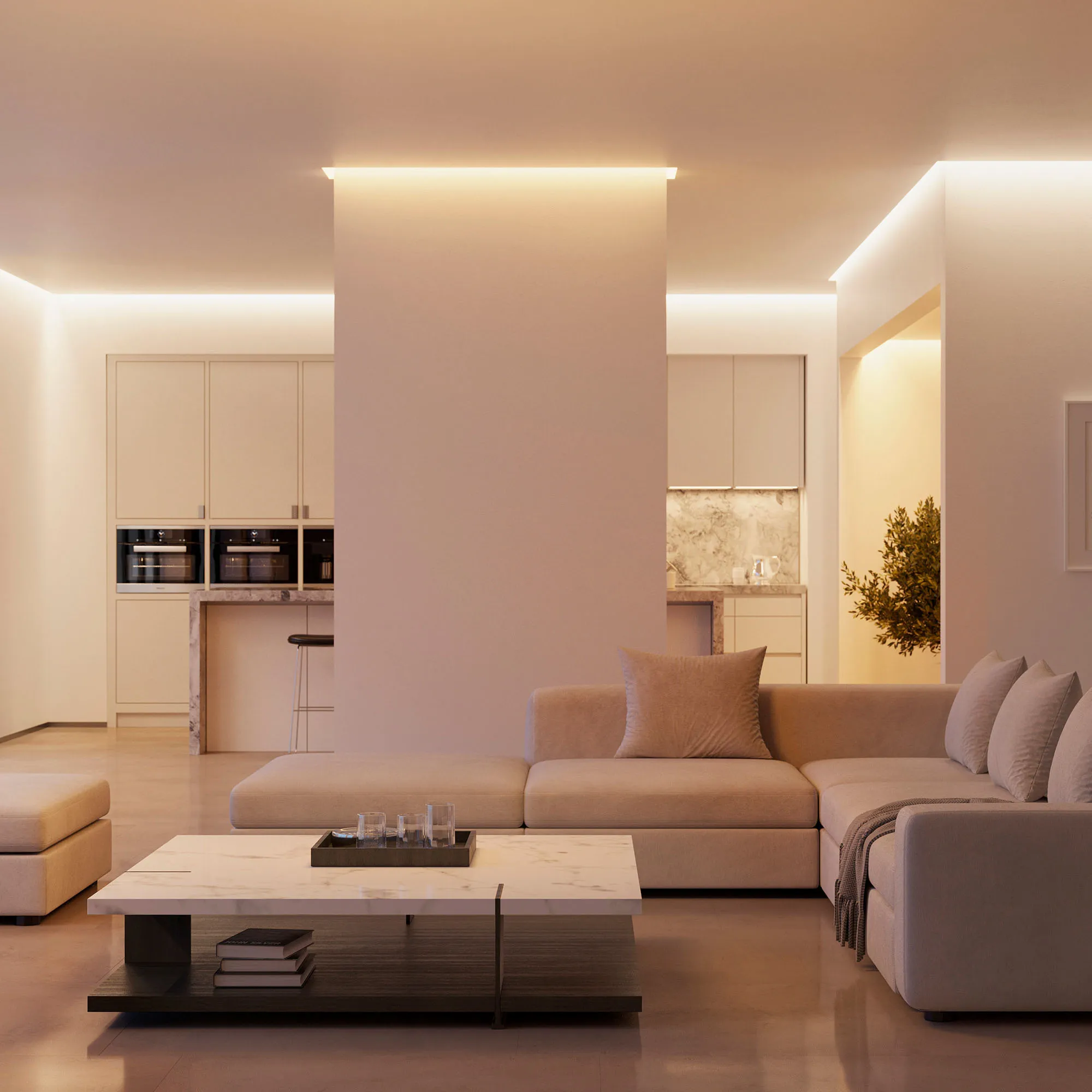 Профиль для создания эффекта парящего потолка с мягким свечением по периметру помещения. Зазор между потолком и стеной 20 мм заполняется свечением от ленты и создает комфортную расслабляющую атмосферу. Стильное решение для современного минималистичного интерьера.